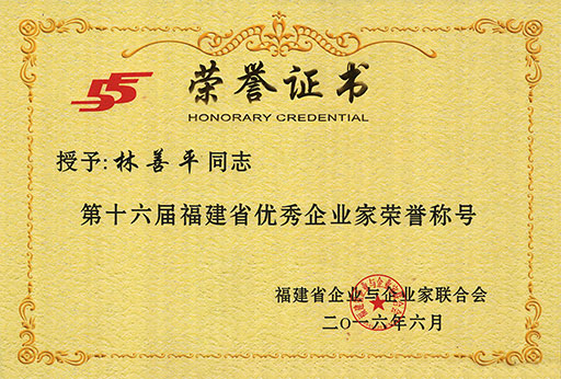 为弘扬优秀企业家深化改革、科学管理、与时俱进、勇于创新的开拓精神,激励广大企业家敢为天下先、爱拼才会赢的闯劲,为推动福建省产业转型升级和经济持续健康发展建功立业,近日,福建省企业与企业家联合会组织开展了每两年评选一次的福建省优秀企业家评选工作,并于2016年6月24日决定授予98位企业经营管理者“第十六届福建省优秀企业家”荣誉称号,广发(中国)公司董事长林善平荣获该荣誉称号。