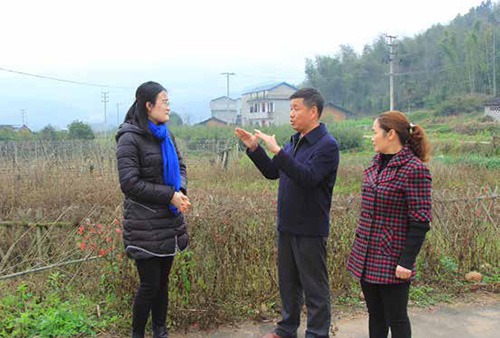 林善平代表(中)走访回乡的大学毕业生施颖( 左一),鼓励她扎根山区,为山区发展贡献聪明才智。摄影/ 王争