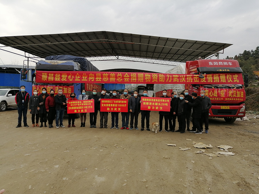 2020年3月6日,福建省顺昌县爱心企业向县慈善总会定向捐赠的第二批物资助力武汉捐赠仪式在顺昌县绿通物流举行。由台盟福建省委会、福建省顺昌合亿农产品开发有限公司捐赠的绿仙椒罐头10吨(3千件)、福建顺昌茂盛食品有限公司捐赠的清水罐头20吨、福建省顺昌县工厂化食用菌同业协会捐赠的海鲜菇18800斤等物资带着顺昌人民与武汉人民共克时艰、共抗疫情的深情厚意无偿驰援武汉。