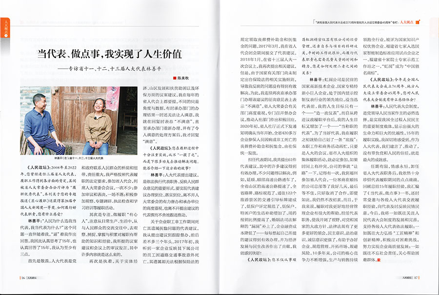 林善平:广发(中国)公司是民营的国家高新技术企业、国家专精特新小巨人企业,处于国内显示控制仪表行业的领先地位。没当选代表前,我的人生目标只有一个——“造一流仪表”,而自从跨进议政履职平台后,我的人生目标又增加了一个——“当称职的代表”。为了当好代表,我在履职之初就给自己划了一条“底线”:本职工作和商务活动再忙,只要是人大的会议、省市人大组织的集体履职活动,就必定参加。如果时间上有冲突,公司的事就“让路”一下。记得有一次,我到福州参加省人代会,一位客商在顺昌的公司总部等了我好几天,最后等不住,只好取消了合作。即便如此,我仍然不改初衷。而且,于我来说,履职对我更好地经营管理企业有很大的帮助。担任代表职务,使我开阔了视野,对党和国家的大政方针政策、法律法规有了更多更好的领会,民主意识、法治意识、诚信意识更强了,有助于办好企业、规范管理、开拓市场、规避风险。10多年来,公司的核心竞争力不断增强,生产与销售持续领跑全行业,被评为国家知识产权优势企业、福建省七家入选国家智能制造标准应用试点企业之一、福建省十家院士专家示范工作站之一,“广发(中国)”成为“中国驰名商标”。