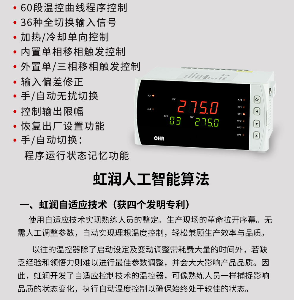 OHR-E400系列60段人工智能温控器采用真正的人工智能算式,仪表启动自整定功能,可以根据被控对象的特性,自动寻找参数以达到很好的控制效果,无需人工整定参数。控温精度基本达±0.1℃,无超调、欠调,达国际先进水平。