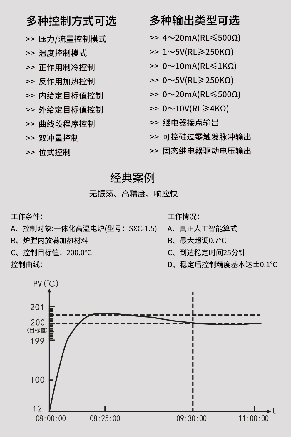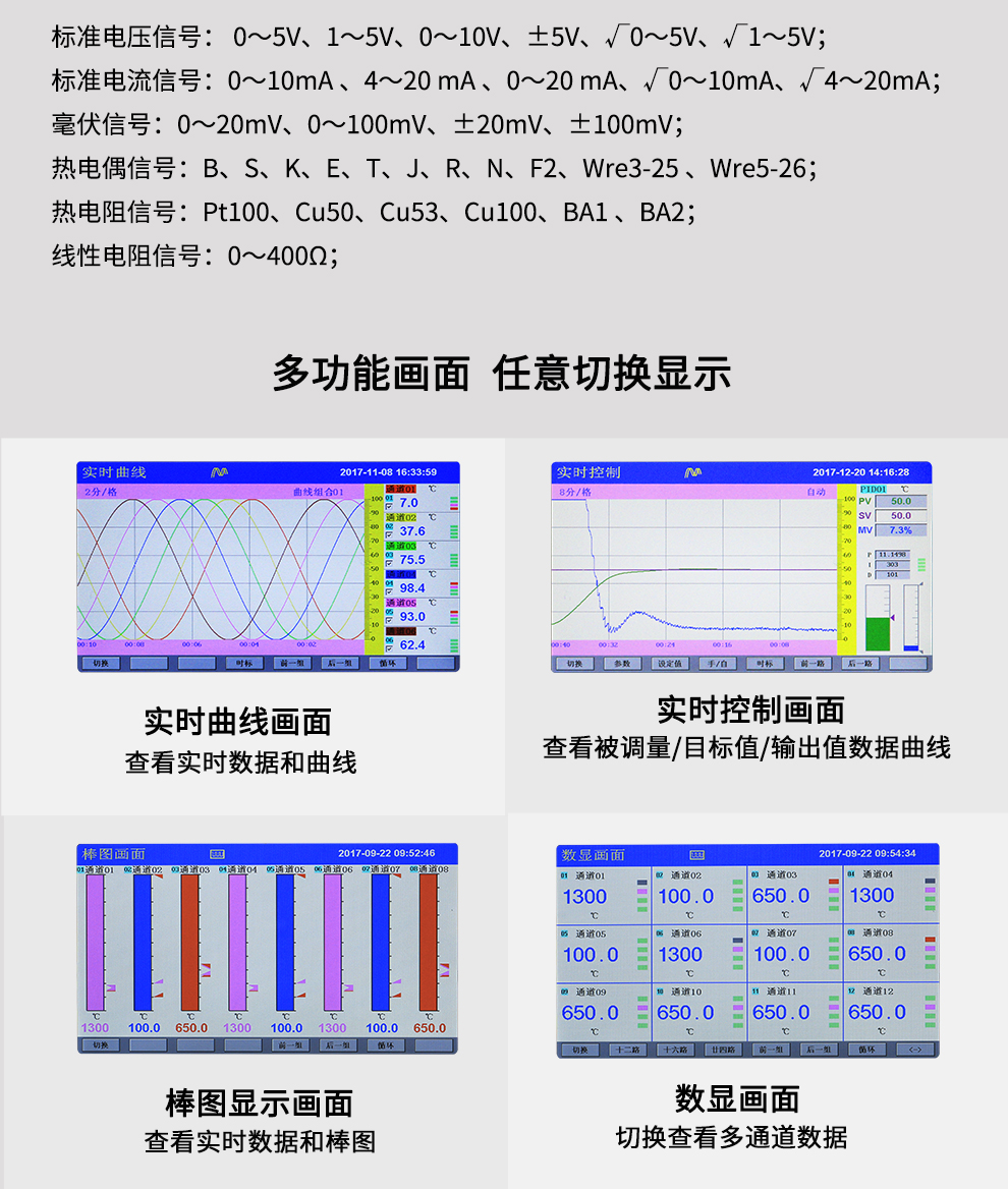 OHR-H300系列彩色调节无纸记录仪采用真正的人工智能算式,仪表启动自整定功能,可根据被控对象的特性,自动寻找最优参数以达到很好的控制效果,无需人工整定参数。控温精度基本达±0.1℃,无超调、欠调,达国际先进水平。24路万能输入(可组态选择输入:标准电压、标准电流、热电偶、热电阻、毫伏等)其中可带8路控制输入。