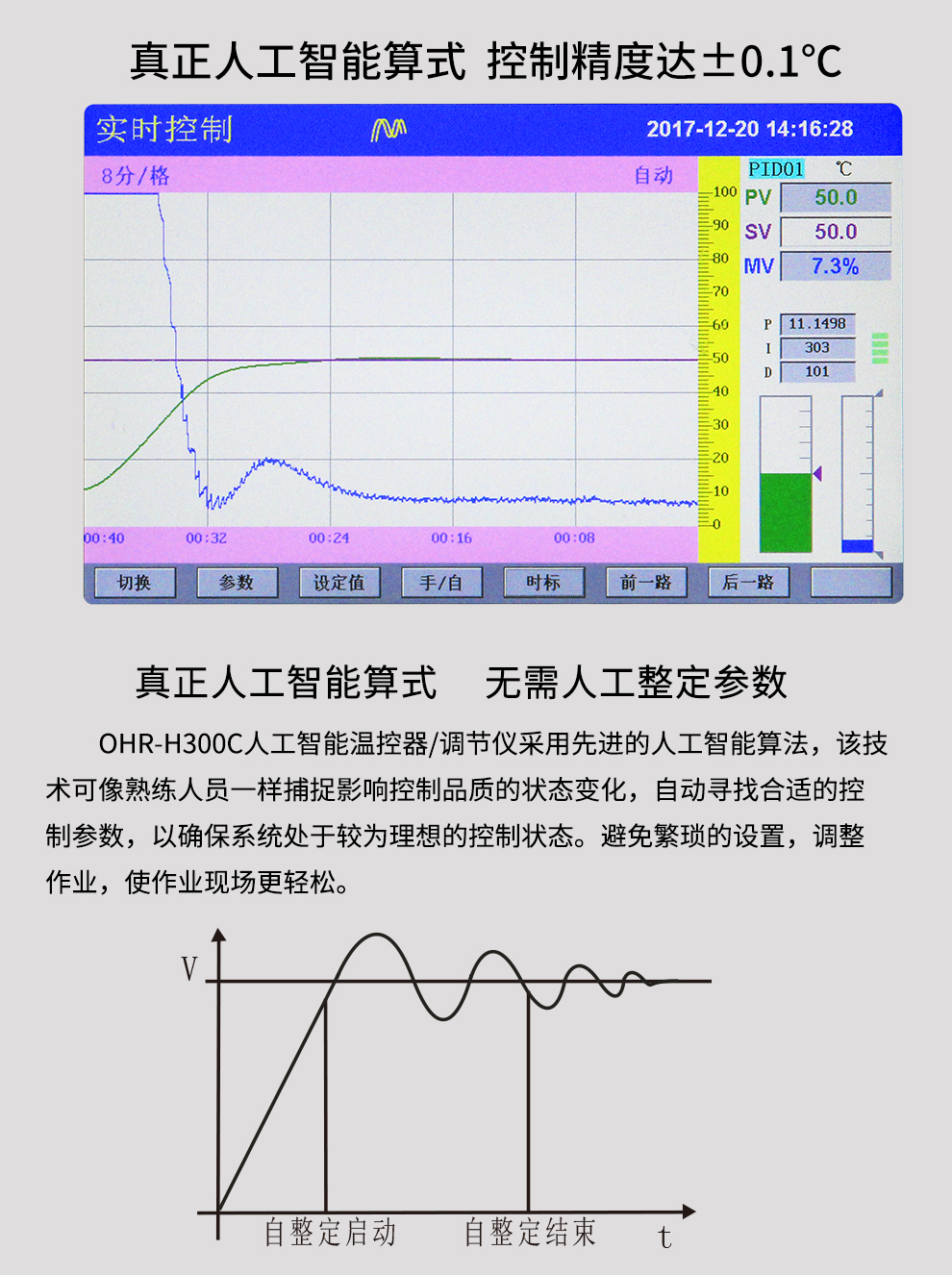 OHR-H300C系列触摸式温控器采用真正的人工智能算式,仪表启动自整定功能,可以根据被控对象的特性,自动寻找最优参数以达到很好的控制效果,无需人工整定参数。控温精度基本达±0.1℃,无超调、欠调,达国际先进水平。24路万能输入(可组态选择输入:标准电压、标准电流、热电偶、热电阻、毫伏等)其中可带8路控制输入。