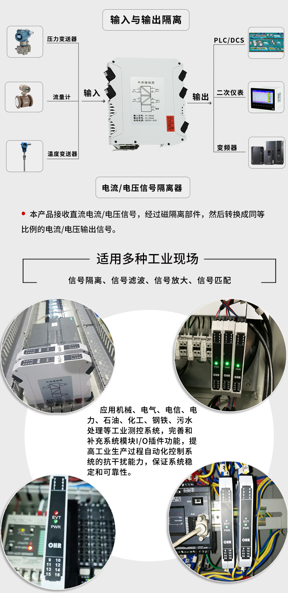 OHR-M21系列电压/电流隔离器将直流电压或电流信号经过隔离传送,转换成所需的信号给其它仪表。可以与单元组合仪表及DCS、PLC等系统配套使用,给予现场仪表信号隔离、信号转换、信号分配、信号处理等,从而提高工业生产过程自动控制系统的抗干扰能力,保证系统的稳定性和可靠性。