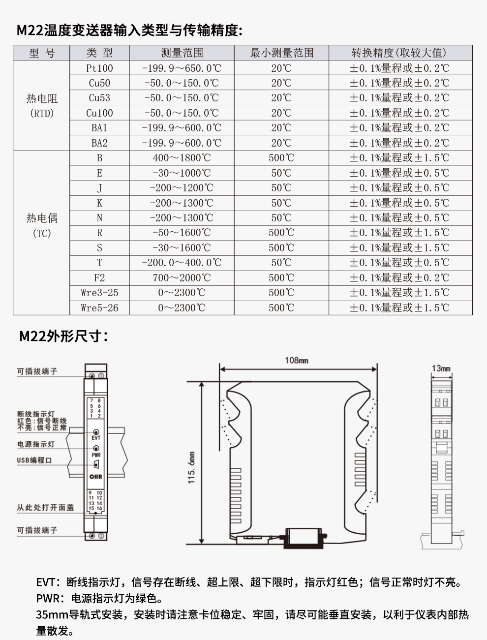 OHR-M22系列智能温度变送器将现场的热电阻或热电偶信号经过隔离放大处理,转换为与温度成线性的直流信号输出至控制系统,用作热电偶温度变送时,具有冷端温度自动补偿功能。