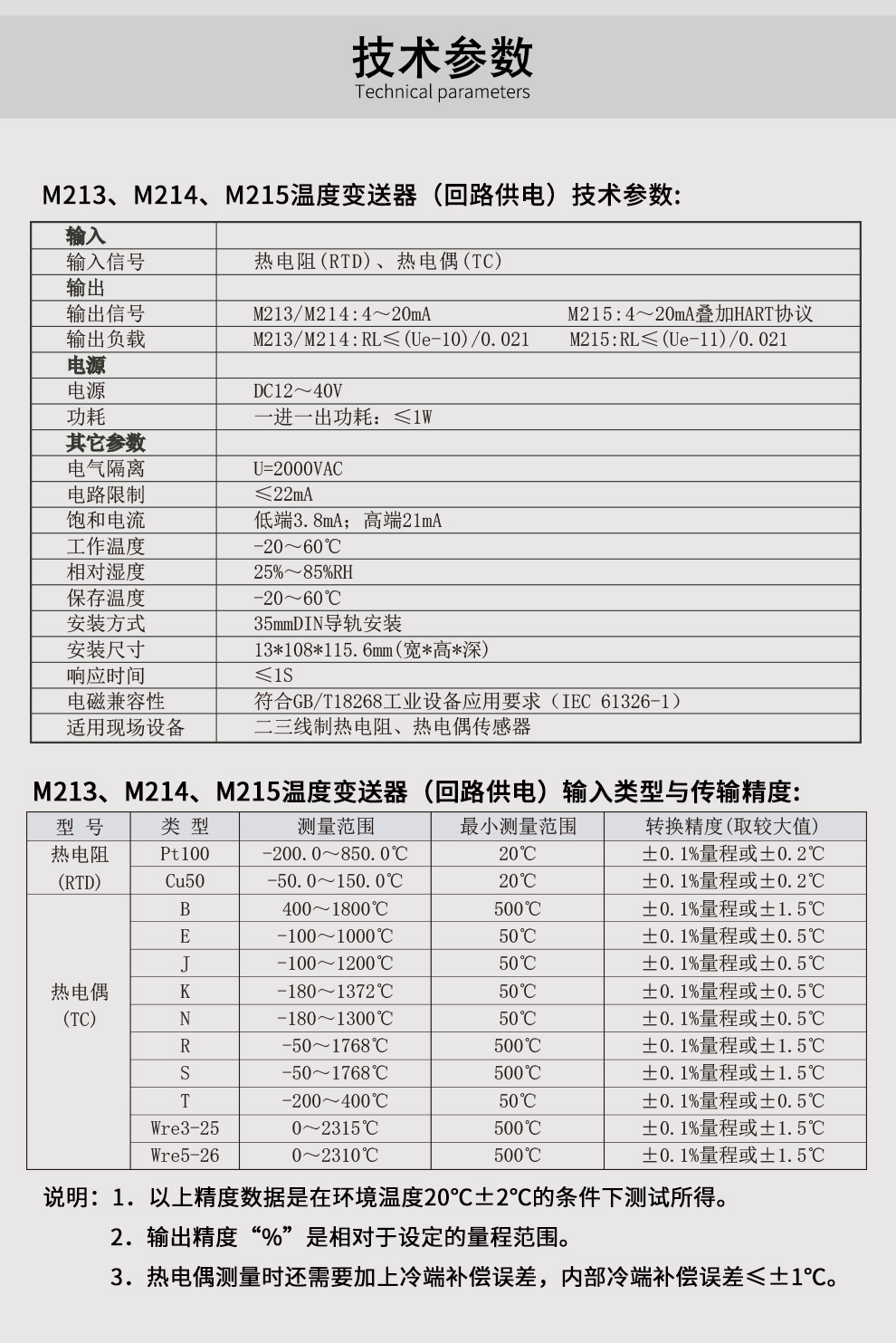 回路供电温度变送器分为M213智能温度变送器、M214隔离智能温度变送器、M215 HART智能温度变送器,变送器将现场的热电阻或热电偶信号经过隔离放大处理,转换为与温度成线性的二线制4-20mA(HART)信号输出至控制系统。