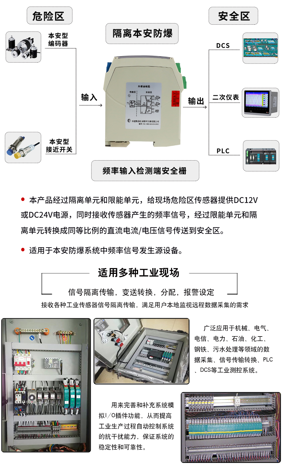 OHR-A34系列频率输入检测端隔离栅可给现场危险区仪表提供12V或24V的隔离电源,危险区仪表产生的频率信号通过安全栅隔离传输到安全侧输出。输入具有较高的抗干扰性能。该产品需独立供电,输入/输出/电源三隔离。本产品可用在频率信号源等设备。