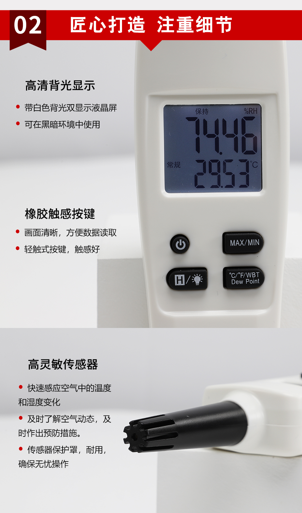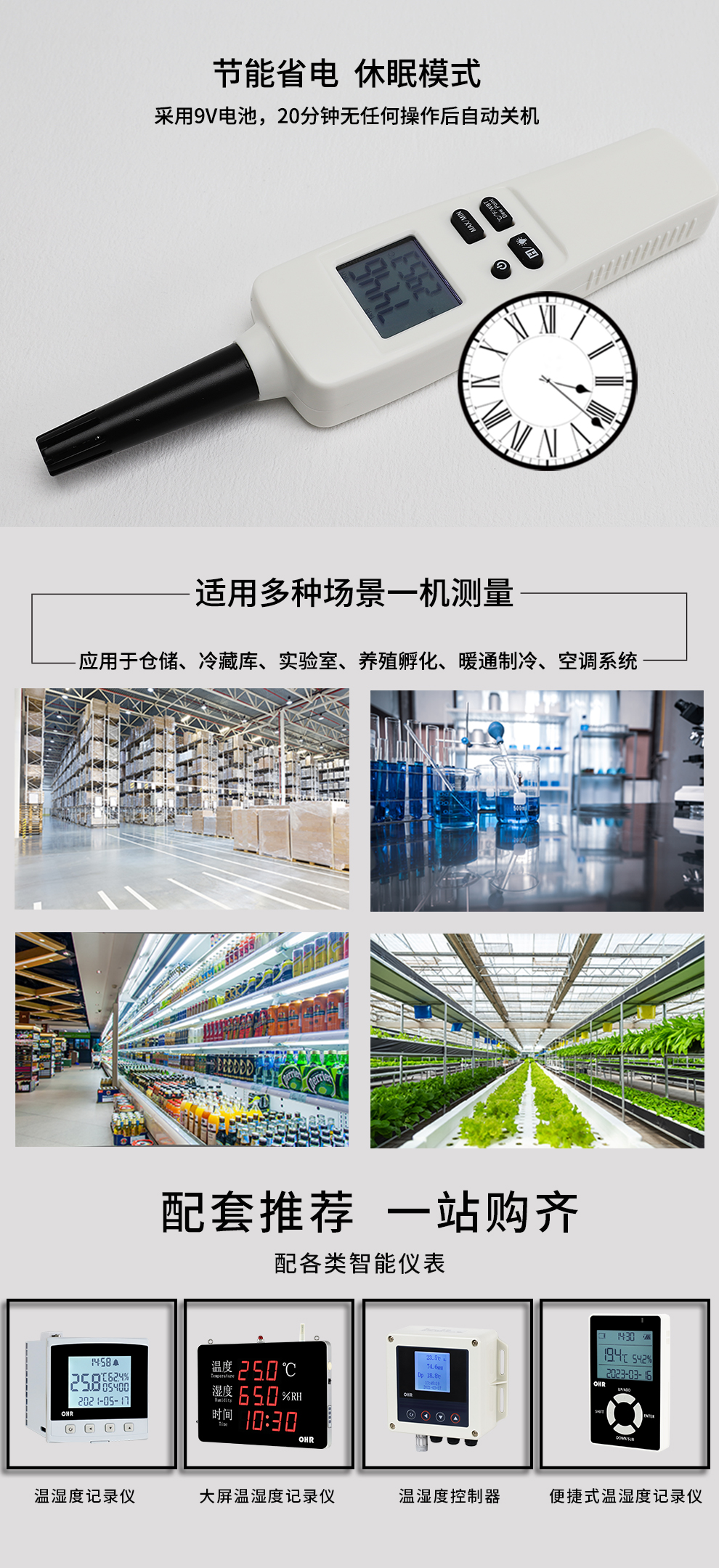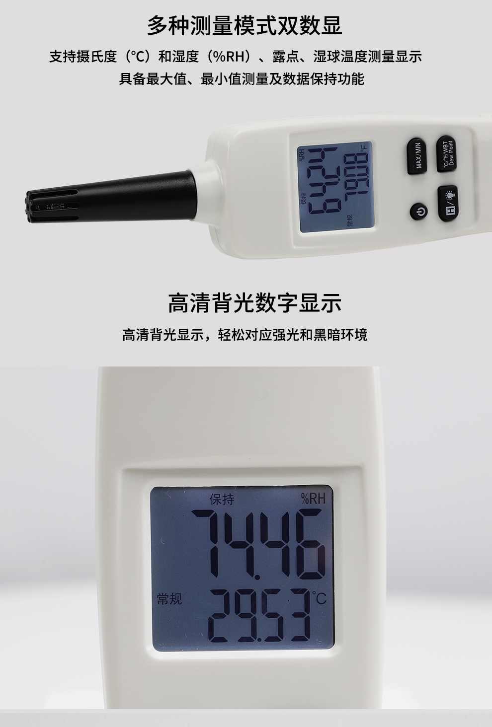 OHR-WS60系列手持式温湿度检测仪采用进口空气温度/湿度传感器,响应时间快,具有空气温度、湿度、露点 温度、湿球温度测量功能,还具备最大值、最小值测量及数据保持功能。手持式高精度测量、小巧的外形便于携 带和使用,带白色背光的双显示液晶屏可在黑暗环境中使用。