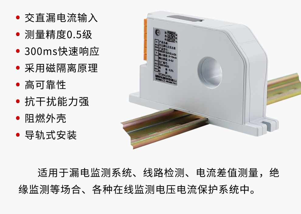 OHR-ES30系列交流/直流漏电流变送器对电网和电路中的交直流电流信号进行实时测量,具有高精度、高隔离、 低漂移、低功耗、体积小、响应快、抗干扰能力强等特点。本产品采用标准DIN35mm导轨安装,端子接线,安装方 便,适用于测量漏电监测系统,线路检测,电流差值测量,绝缘监测等场合。