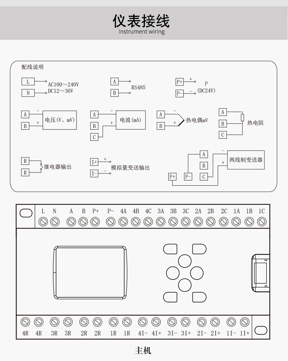 OHR-PR40系列数据控制器多重保护和隔离设 计,抗干扰能力强,可靠性高。仪表采用主副机结构设计,主机可提供4路万能信号输入,通道间 相互隔离;4限报警输出、4路变送输出,馈电输出、RS485通讯、以太网通讯等功能,连接副机可将I/O容量 扩展至8路输入和8限报警输出、8路变送输出。