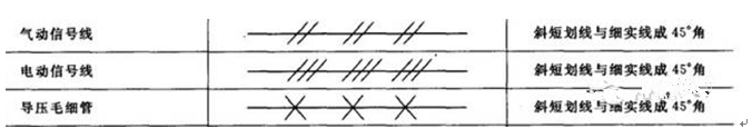 ④ 当通用的仪表信号线为细实线可能造成混淆时,通用信号线符号可在细实线上加斜短划线(斜短划线与细实线成45°角)。