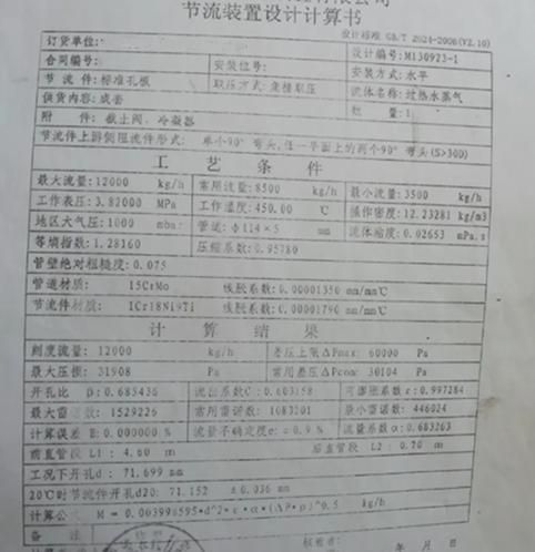 4、根据孔板计算书中数据,流量采用的是减压前的中压蒸汽的温度、压力及相关参数进行的计算,最大差压60kpa,最大流量12000m3/h。
