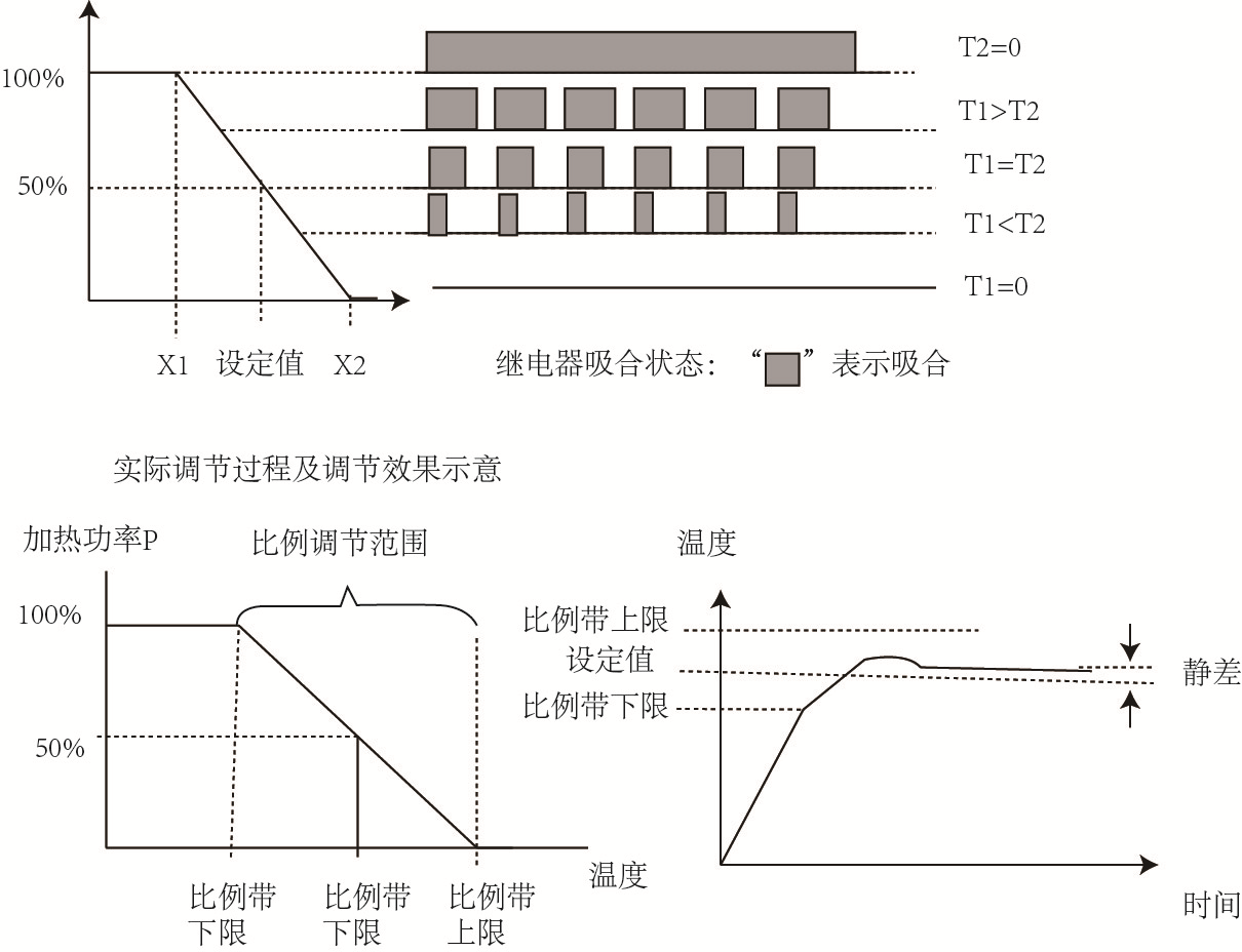 时间比例调节的基本原理:当实际温度进入仪表的下比例带时,继电器即开始周期性地释放、吸合,靠改变吸与放的时间之比值来改变加热负载上的平均加热功率,从而改变温度的目的。吸放的时间同设定值与测量值的偏差成正比,即偏差越大,单位时间(即吸放周期T)内吸合时间越长,反之越短;当偏差为零时,吸放为等周期,而出现负偏差时,吸合时间比释放时间短,直至测量值到达比例带上限,继电器不再吸合,负载上无输出。