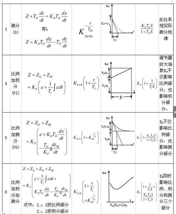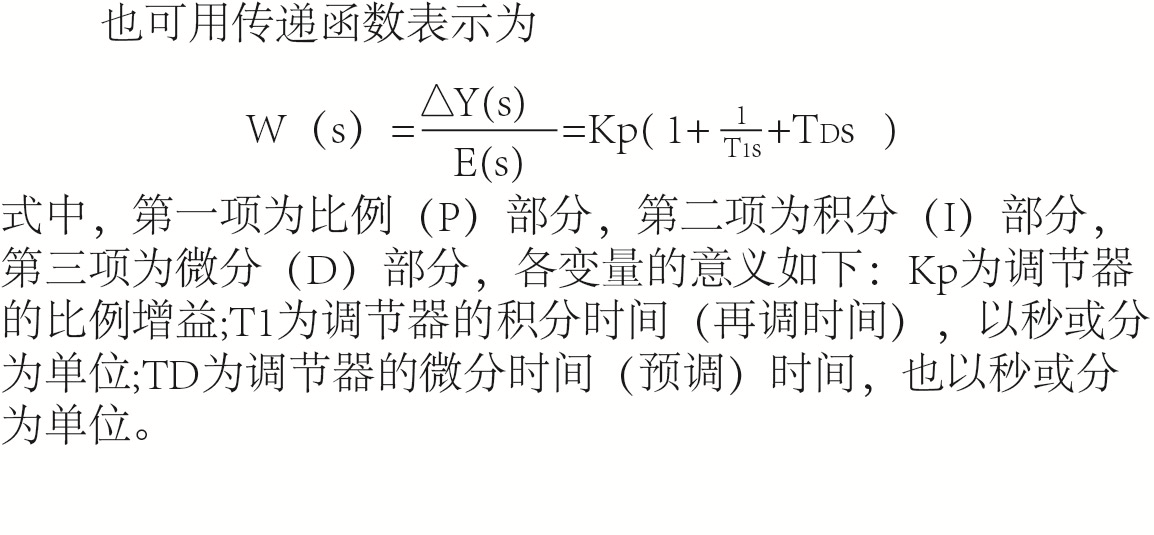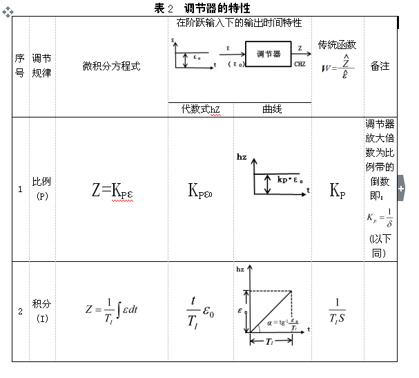 调节器的调节规律或称调节器的特性。第一种称为比例调节规律,第二种称为积分调节规律,第三种称为微分调节规律。此外就是比例加积分,比例加微分以及比例加积分加微分调节规律。这些调节规律的微积分方程式、在阶跃(即讯号一下子)输入下的输出时间特性以及传递函数等。