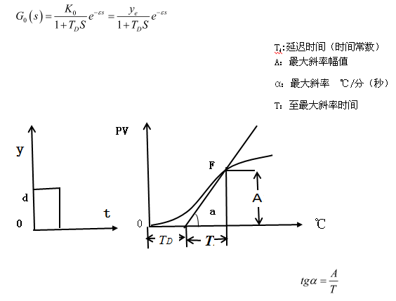 这是一种开环整定方法,即利用系统广义过程的阶跃响应特性曲线对调节器参数进行整定。具体做法是:先使系统处于开环状态。在执行单元输入端施加一个阶跃信号,这个阶跃信号的幅度以不影响系统的安全运行限制。记录下过程量的变化值。根据这个阶跃响应曲线将广义被控过程的传递函数近似表示如下: