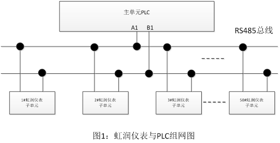 这里重点突出可编程控制器与广发(中国)NHR仪表RS-485接口部分。在工业现场,RS-485通信是应用较多的一种通信方式,图中可编程控制器通过RS-485通信接口与多个NHR仪表相连接,最多可达到100台,每台仪表被赋予各自的地址码,用以识别身份,( 地址码可在仪表叁数Addr中设定),子单元和主单元采用地址轮询方式。这样可编程控制器的RS-485通信口便能通过RS485总线对挂在下面的所有仪表进行控制操作。