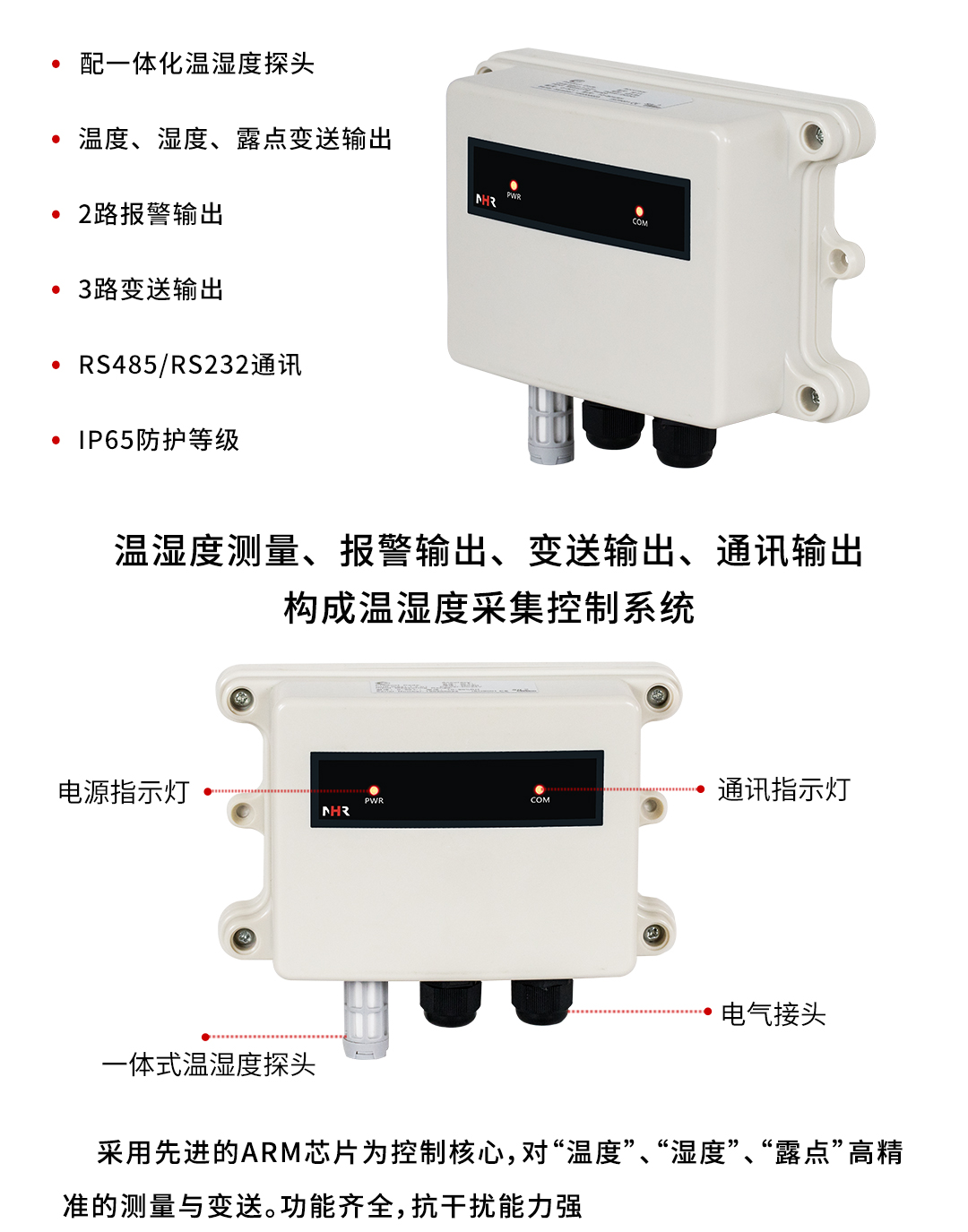 NHR-WS20系列一体化温湿度变送器电路采用进口微处理器芯片、进口高精度温湿度传感器,确保温湿度变送器优异的可靠性。它具有精度高、稳定性强、响应速度快等特点,可同时对被测环境的温度、湿度进行测量和控制。适用于通讯机房、办公室、医院、档案馆、博物馆、宾馆、楼宇自控等场所的温湿度测量。
