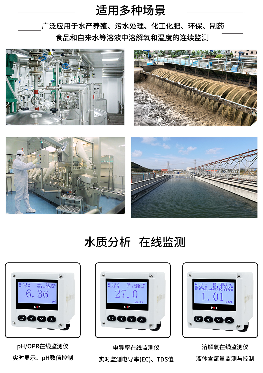 NHR-DO10A系列溶解氧在线监测仪一款智能在线化学分析仪器,采用膜法测量溶解氧。控制器可连续监测数据通 过变送输出实现远传监控,也可以连接RS485接口,通过MODBUS-RTU协议方便联入上位机实现组网监控。广泛应用 于火电、化工化肥、冶金、环保、制药、生化、食品和自来水等溶液中溶解氧和温度的连续监测。