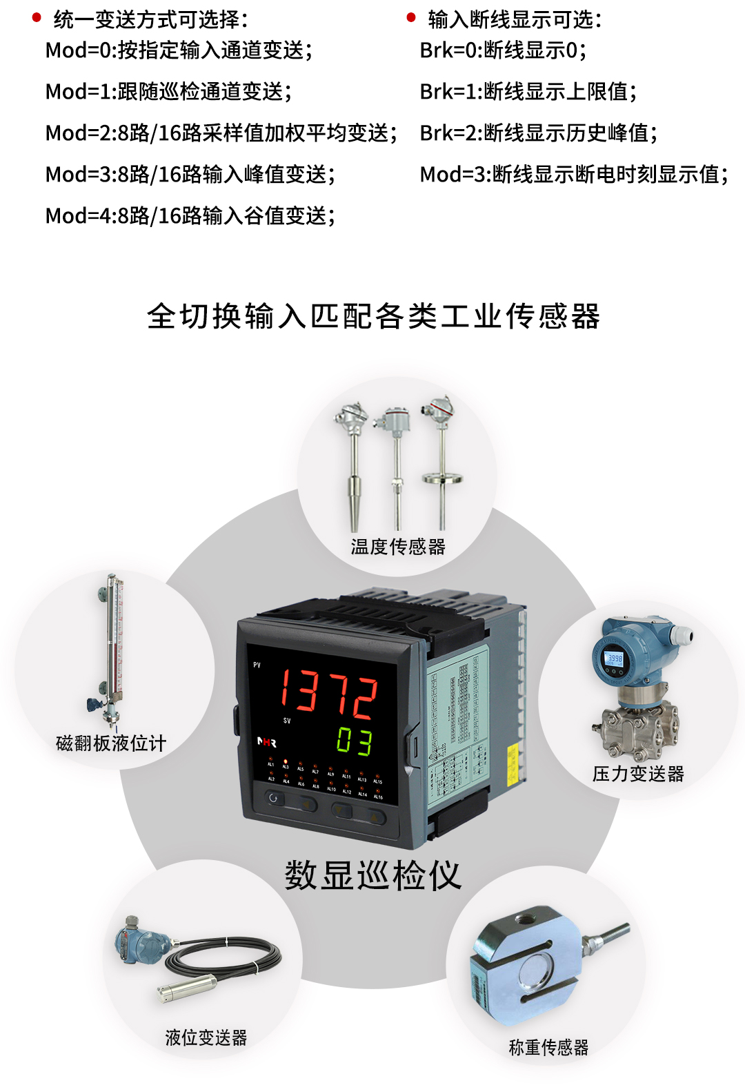 NHR-5700系列多回路测量显示控制仪针对现场温度、压力、液位、速度等各种信号进行采集、显示、控制、远传、通讯、 打印等处理,构成数字采集系统及控制系统,适用于需要进行多测量点巡回检测的系统。