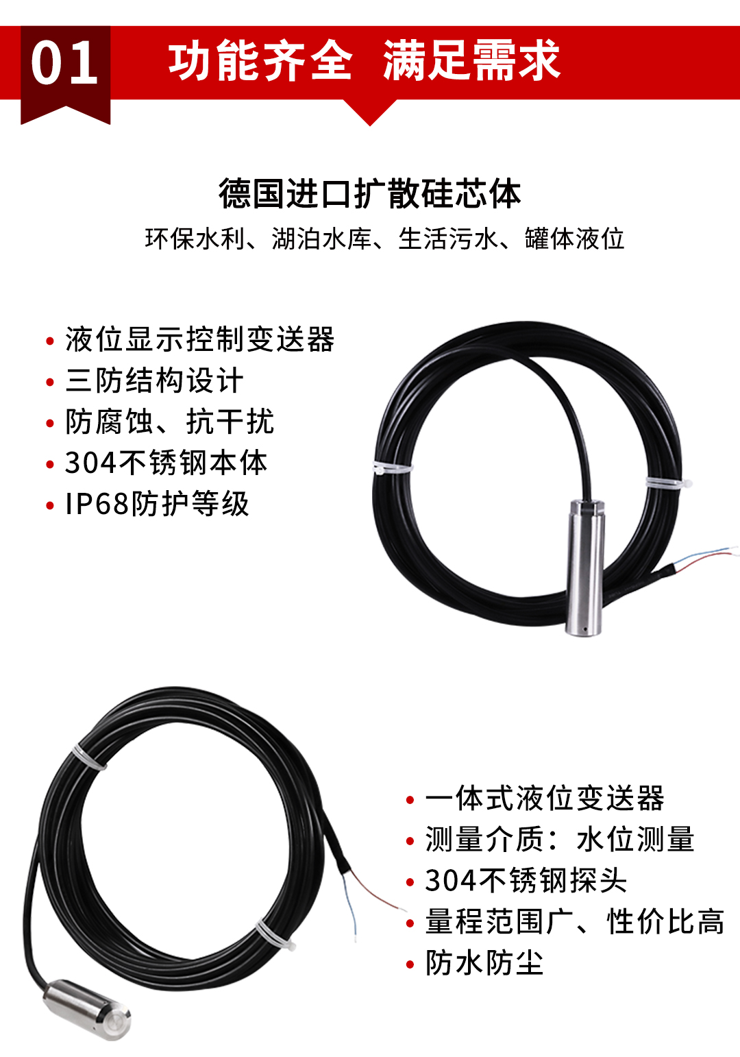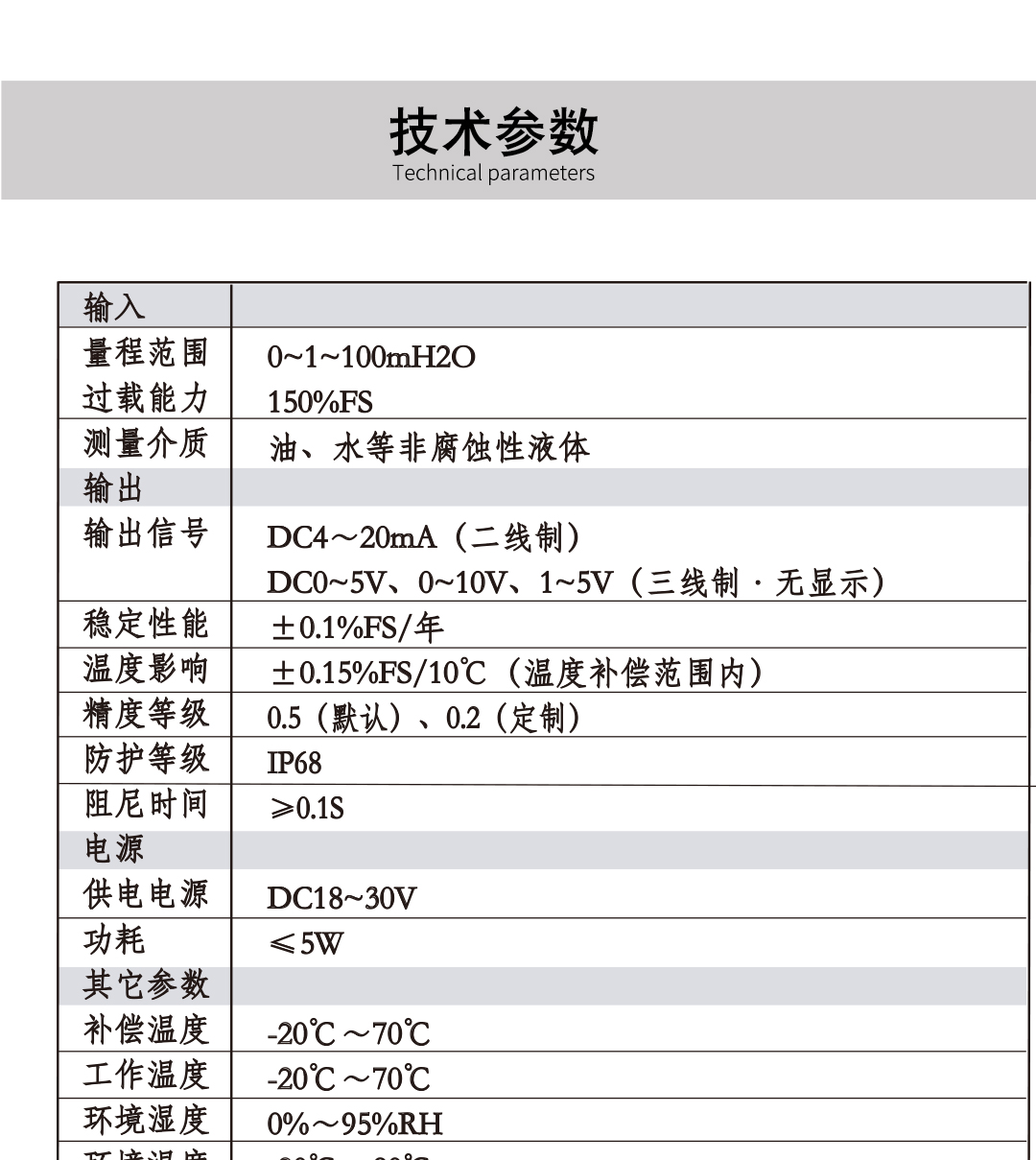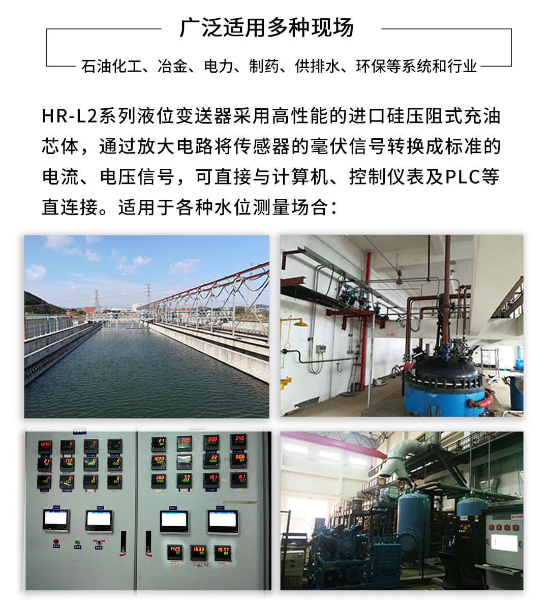 HR-L系列静压液位变送器使用进口高精度、高稳定性扩散硅压力敏感芯片,通过高可靠性的放大电路,将被测液体的液位信号转换成4~20mA DC标准信号。