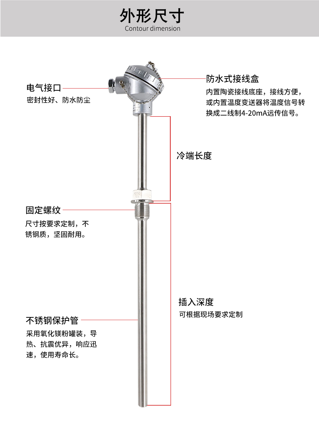 装配式热电阻热电偶作为温度测量传感器,通常与温度变送器、调节器及显示仪表等配套使用,组成过程控制系统,用以直接测量或控制各种生产过程中流体、蒸汽和气体介质以及固体表面等温度。