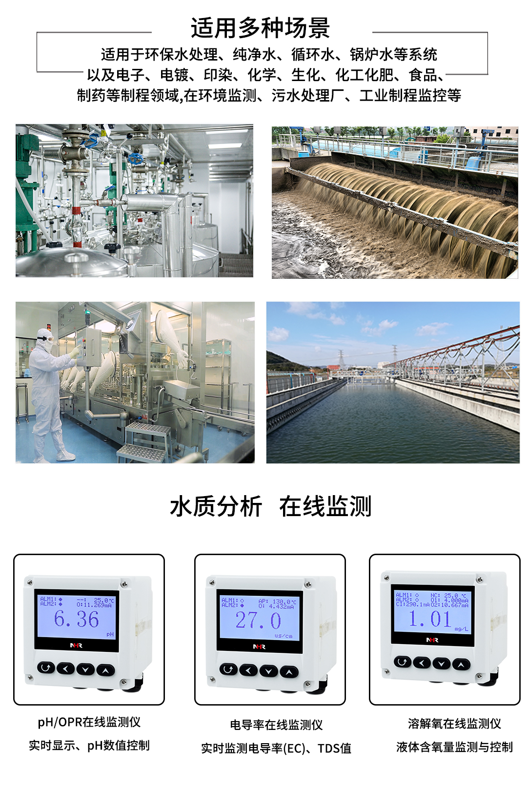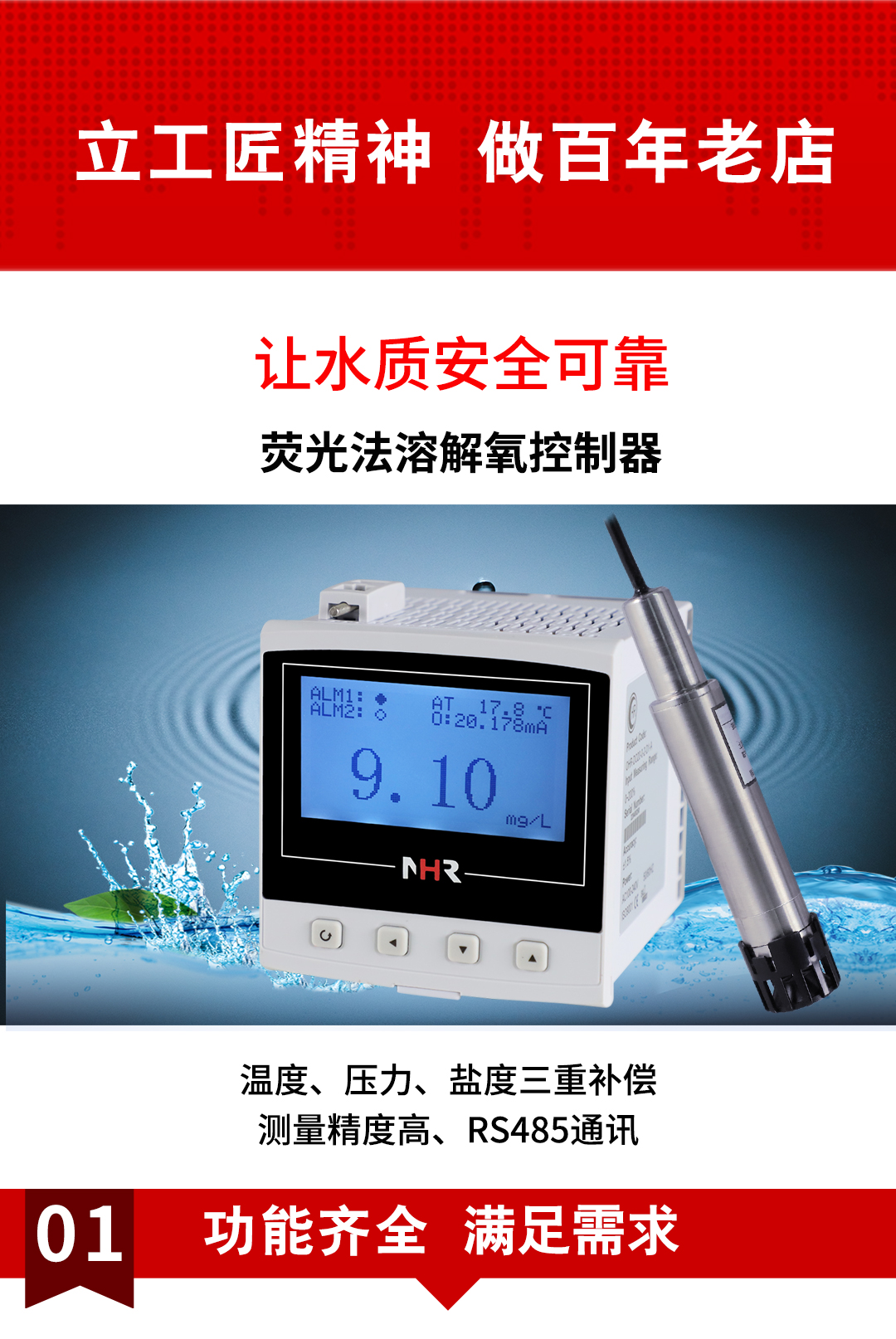 NHR-DO20A系列荧光法溶解氧控制器是一款智能在线化学分析仪器,采用荧光猝灭原理测量溶解氧。控制器可连 续监测水中氧含量,通过变送输出或RS485输出实现远传监控。广泛应用于火电、化工化肥、冶金、环保、制药、食品、水产养值、污水处理和自来水等溶液中溶 解氧和温度的连续监测。