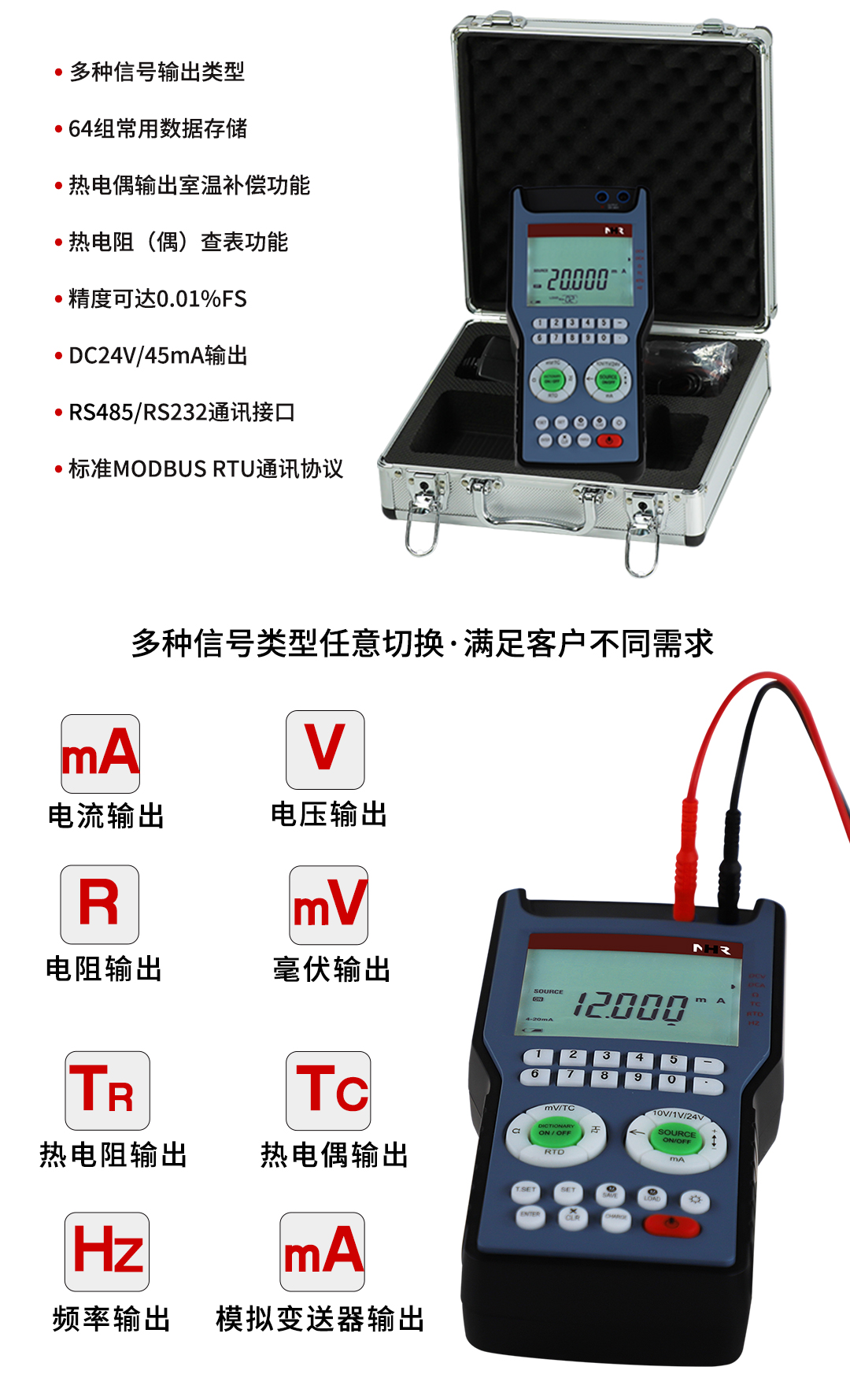 NHR-200信号发生器是一种多功能、高精度的便携式信号源,可用于输出各种规格的工业信号,支持电流、电压、电阻、频率、热电偶、热电阻等多种信号输出类型,最高精度可达0.01%F.S,是工业现场、实验室以及各类仪表制造商必备的计量测试工具。