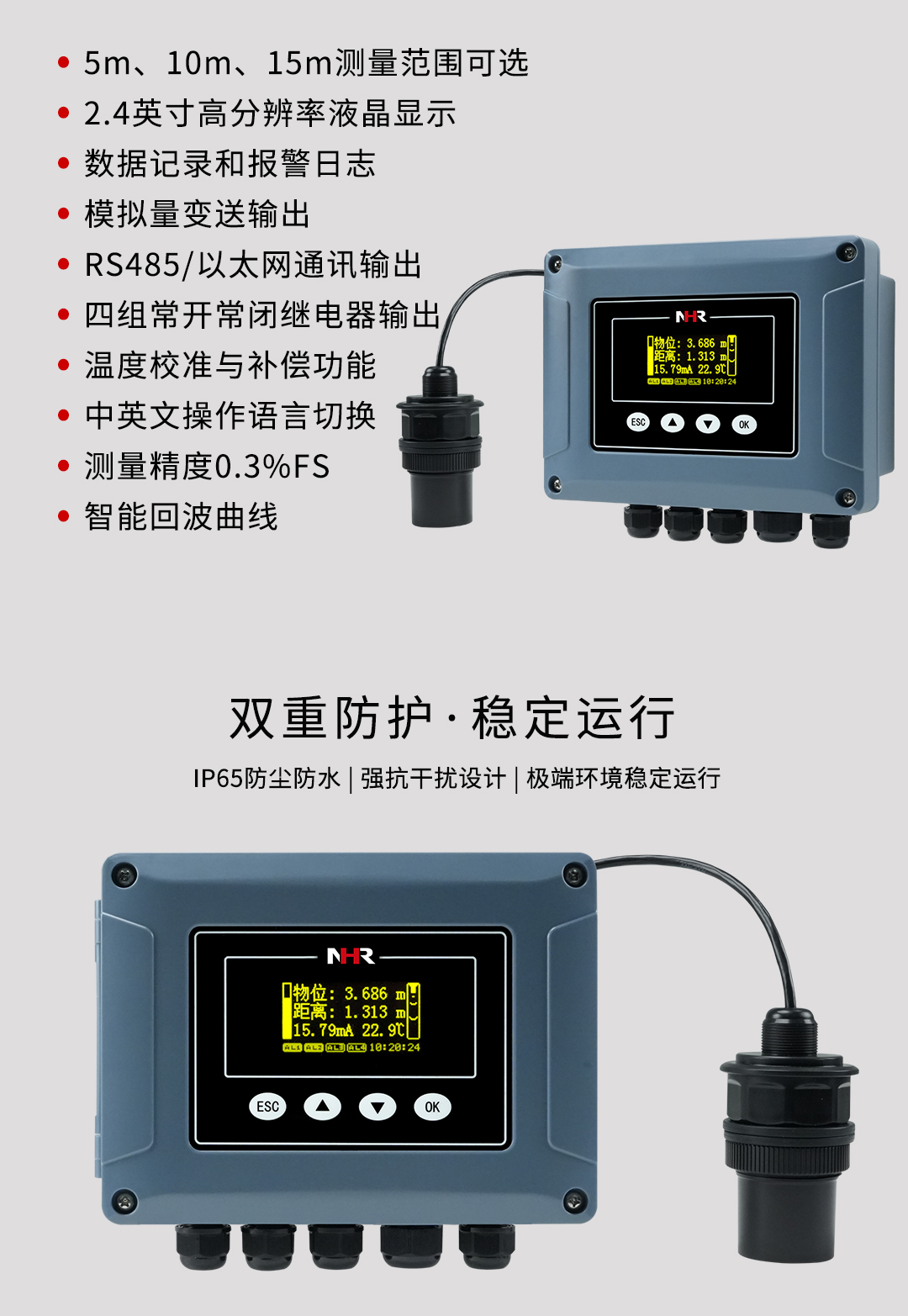 NHR - LC11 系列分体式超声波液位计,是一款功能全面且便捷实用的液位 / 物位测量仪器。它具备数据记录与报警日志功能,安装与维护都极为简便。该液位计采用非接触式测量,无需与介质直接接触,就能精准满足大多数液位 / 物位的测量需求。