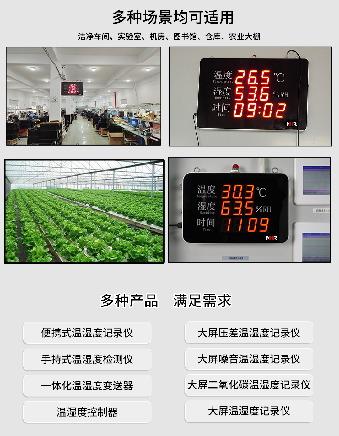 NHR-WS56/WS57系列大屏压差温湿度记录仪采用高精度的采集电路及进口传感器,对环境的压差、温湿度 等进行实时监测、报警与记录。本产品采用铝合金边框,高品质亚克力面板,外观美观大方;大屏幕LED 数码管显示,醒目、便捷,实时显示压差值、温湿度值和露点值等信息;可选配RS485、RS232通讯接口或 以太网通讯接口,通过配套的上位机软件读取历史记录。