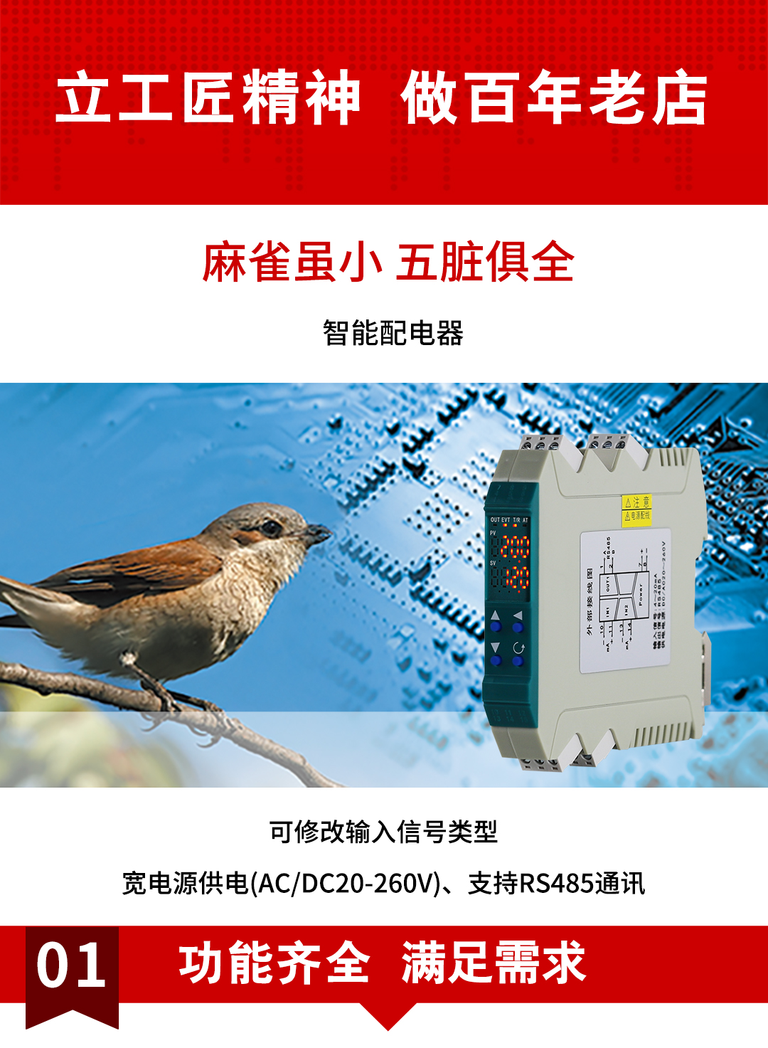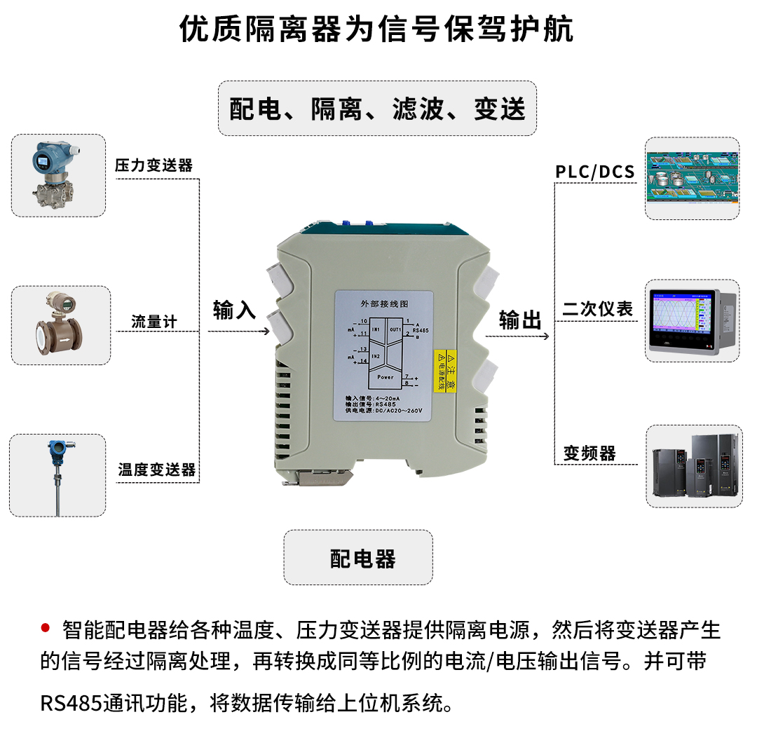 NHR-X33系列导轨式智能配电器给二、三线制变送器提供隔离的电源电压,将变送器产生的直流电压电流信号,经本隔离器转换成所需的输出信号至控制系统。宽电源设计:20-260V交直流供电。配置高清显示单元,通过轻触按键设置每个通道的参数及每个通道之间的切换。