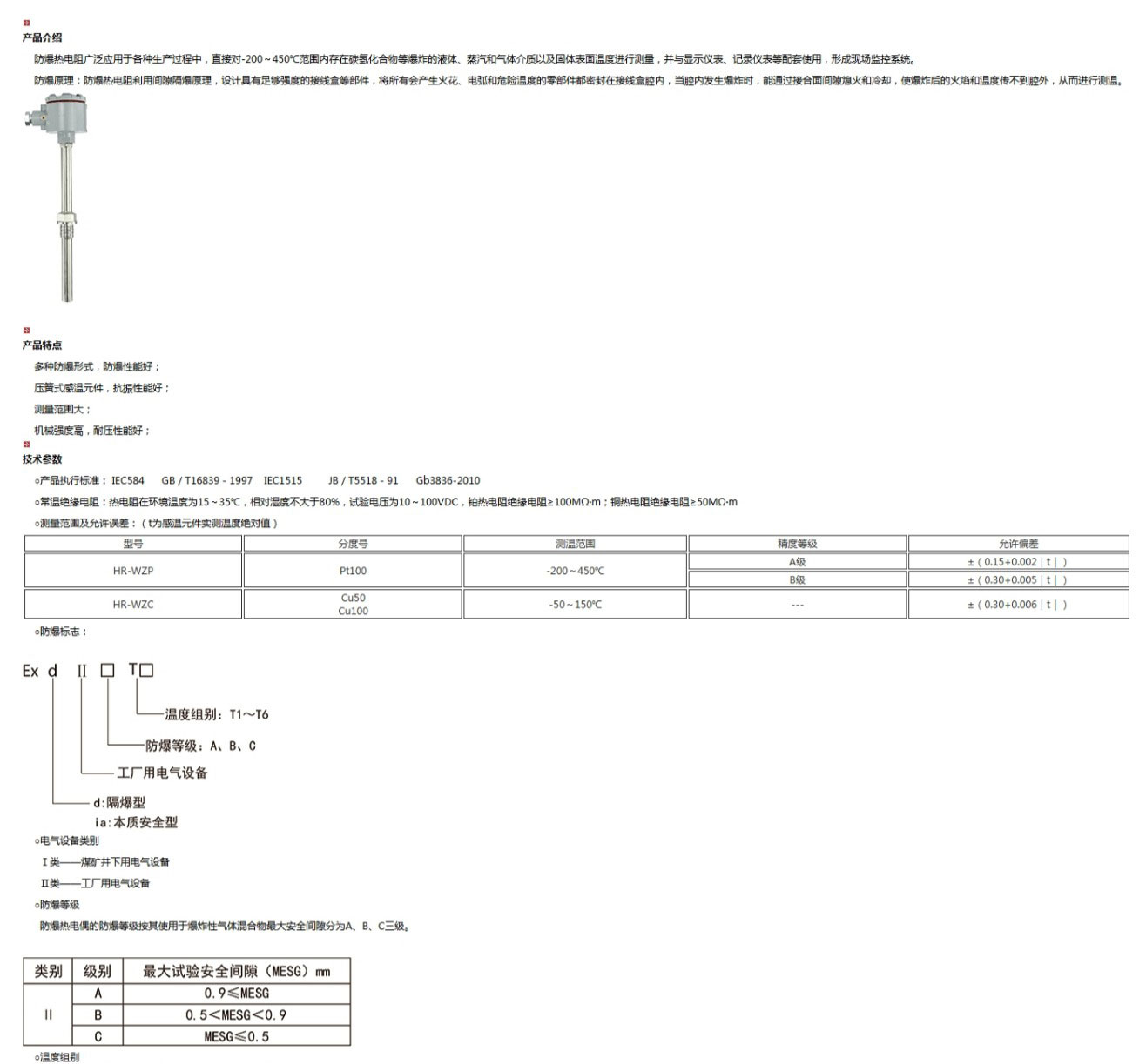 防爆热电阻广泛应用于各种生产过程中,直接对-200~450℃范围内存在碳氢化合物等爆炸的液体、蒸汽和气体介质以及固体表面温度进行测量,并与显示仪表、记录仪表等配套使用,形成现场监控系统。