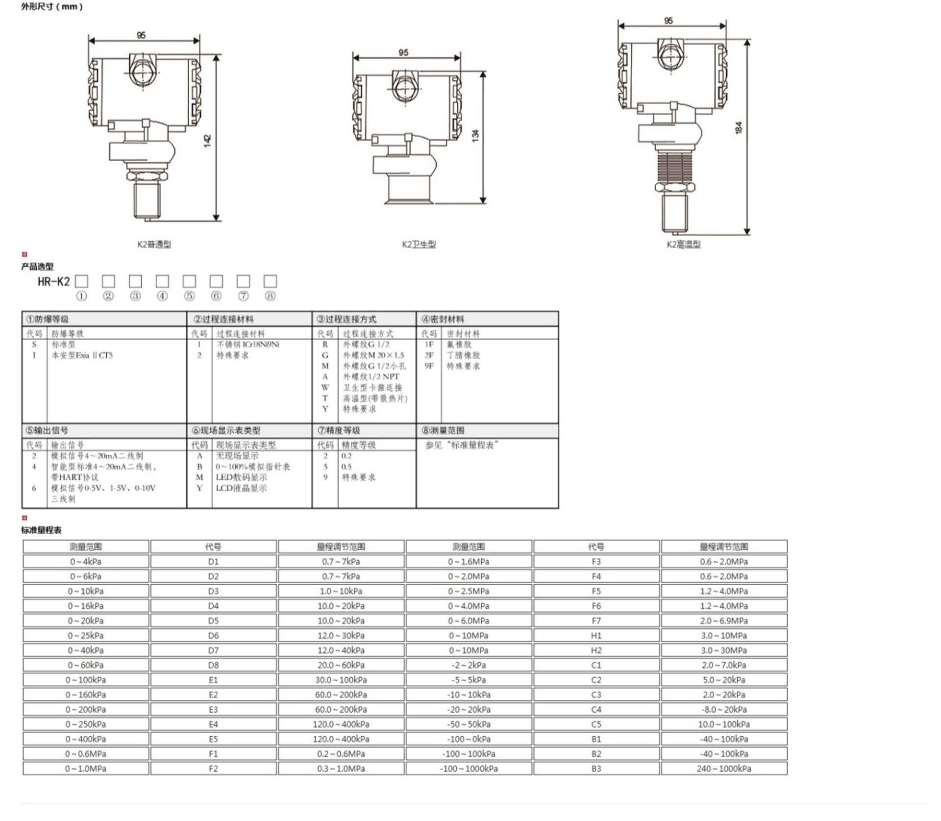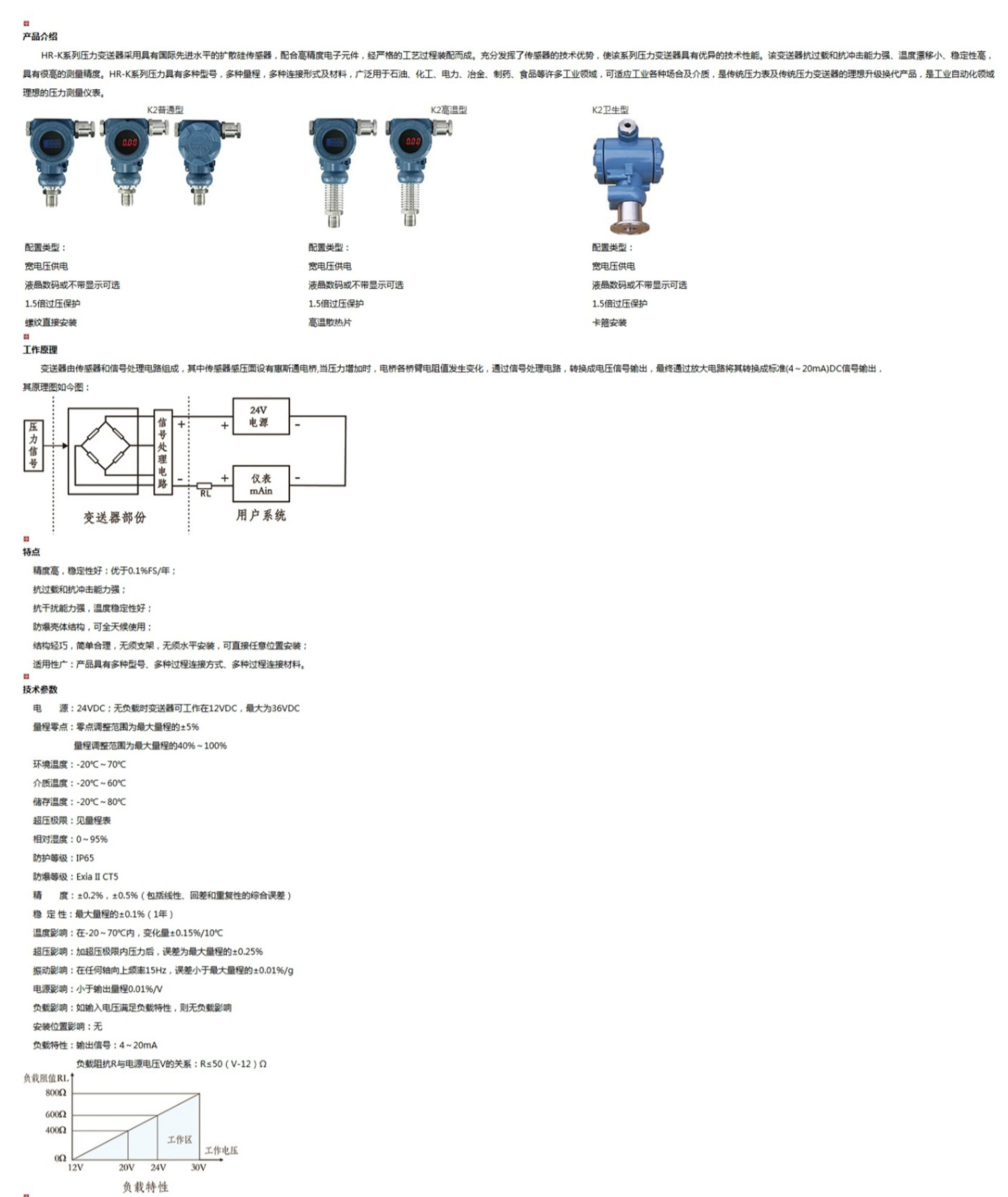 HR-K系列压力变送器采用具有国际先进水平的扩散硅传感器,配合高精度电子元件,经严格的工艺过程装配而成。充分发挥了传感器的技术优势,使该系列压力变送器具有优异的技术性能。该变送器抗过载和抗冲击能力强、温度漂移小、稳定性高,具有很高的测量精度。