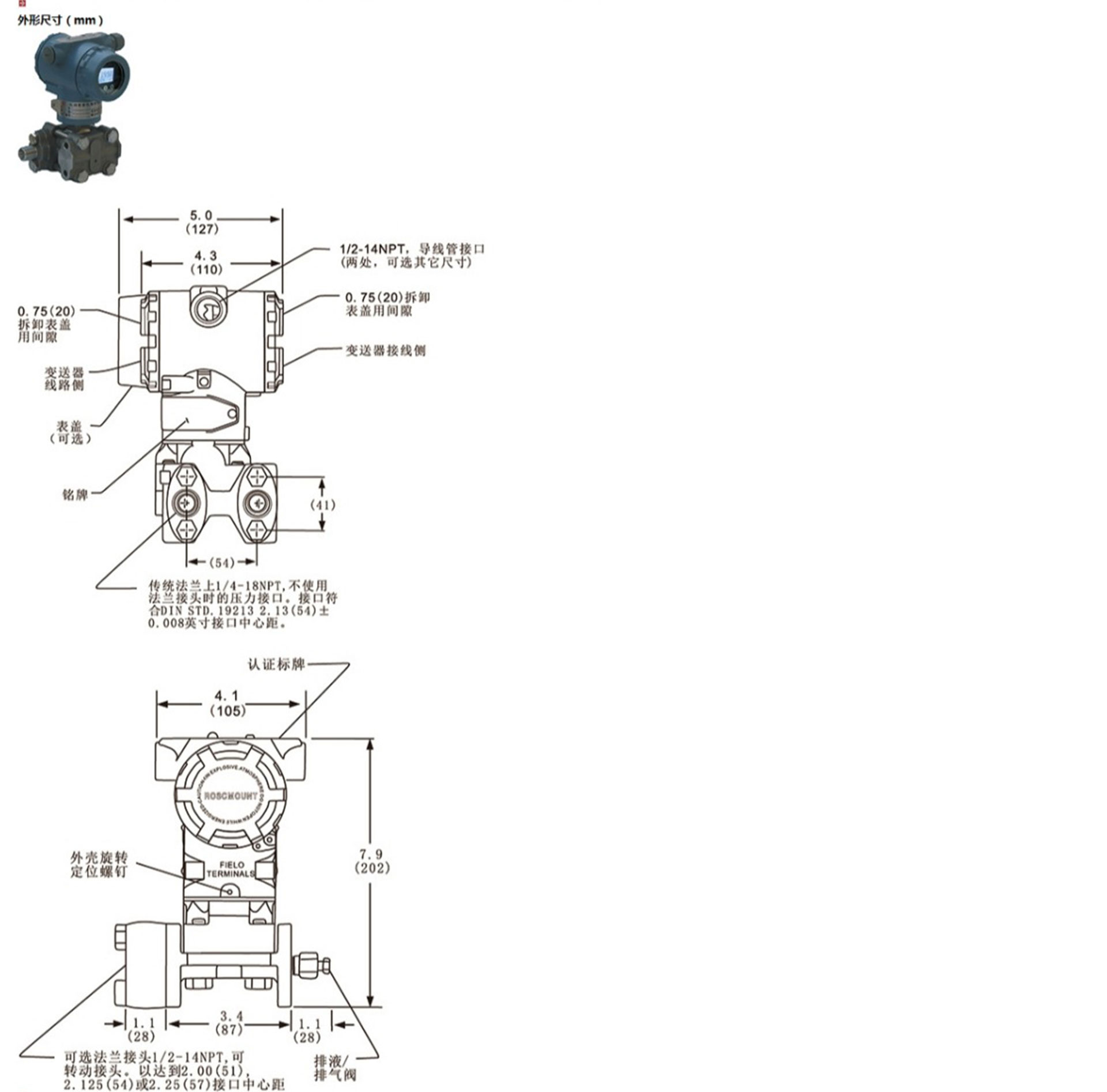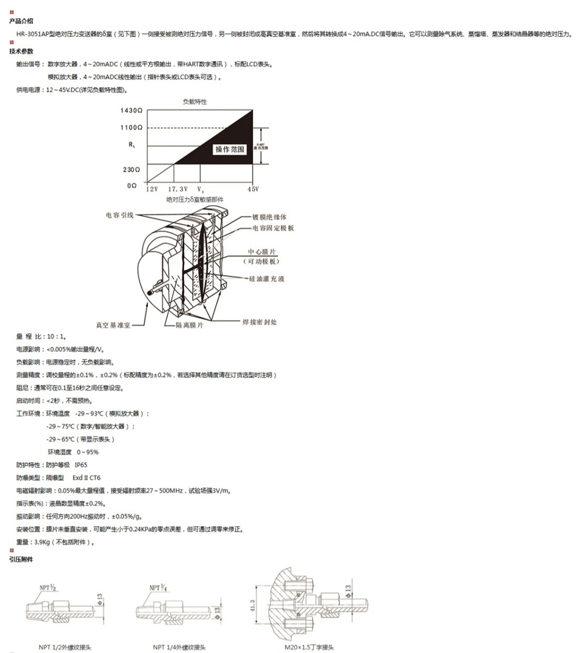 HR-3051AP型绝对压力变送器的δ室(见下图)一侧接受被测绝对压力信号,另一侧被封闭成高真空基准室,然后将其转换成4~20mA.DC信号输出。它可以测量除气系统、蒸馏塔、蒸发器和结晶器等的绝对压力。