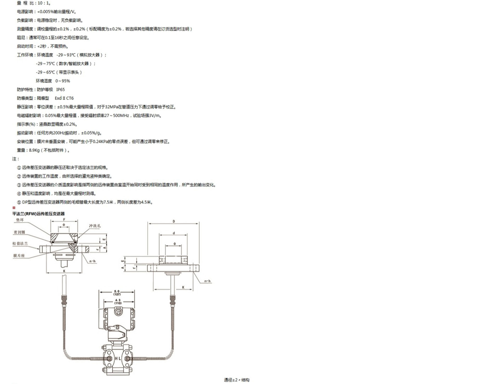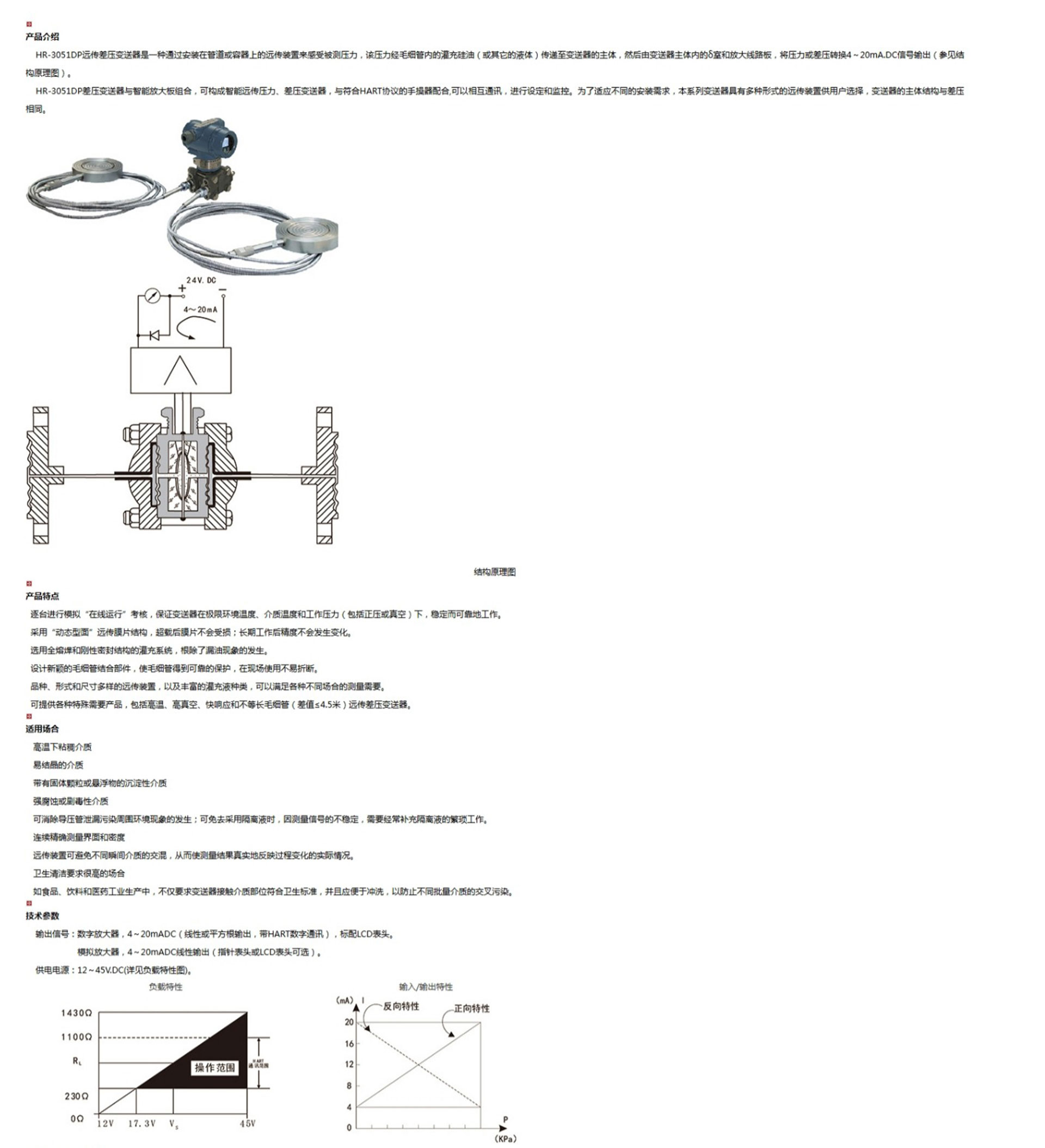 HR-3051DP远传差压变送器是一种通过安装在管道或容器上的远传装置来感受被测压力,该压力经毛细管内的灌充硅油(或其它的液体)传递至变送器的主体,然后由变送器主体内的δ室和放大线路板,将压力或差压转换4~20mA.DC信号输出。