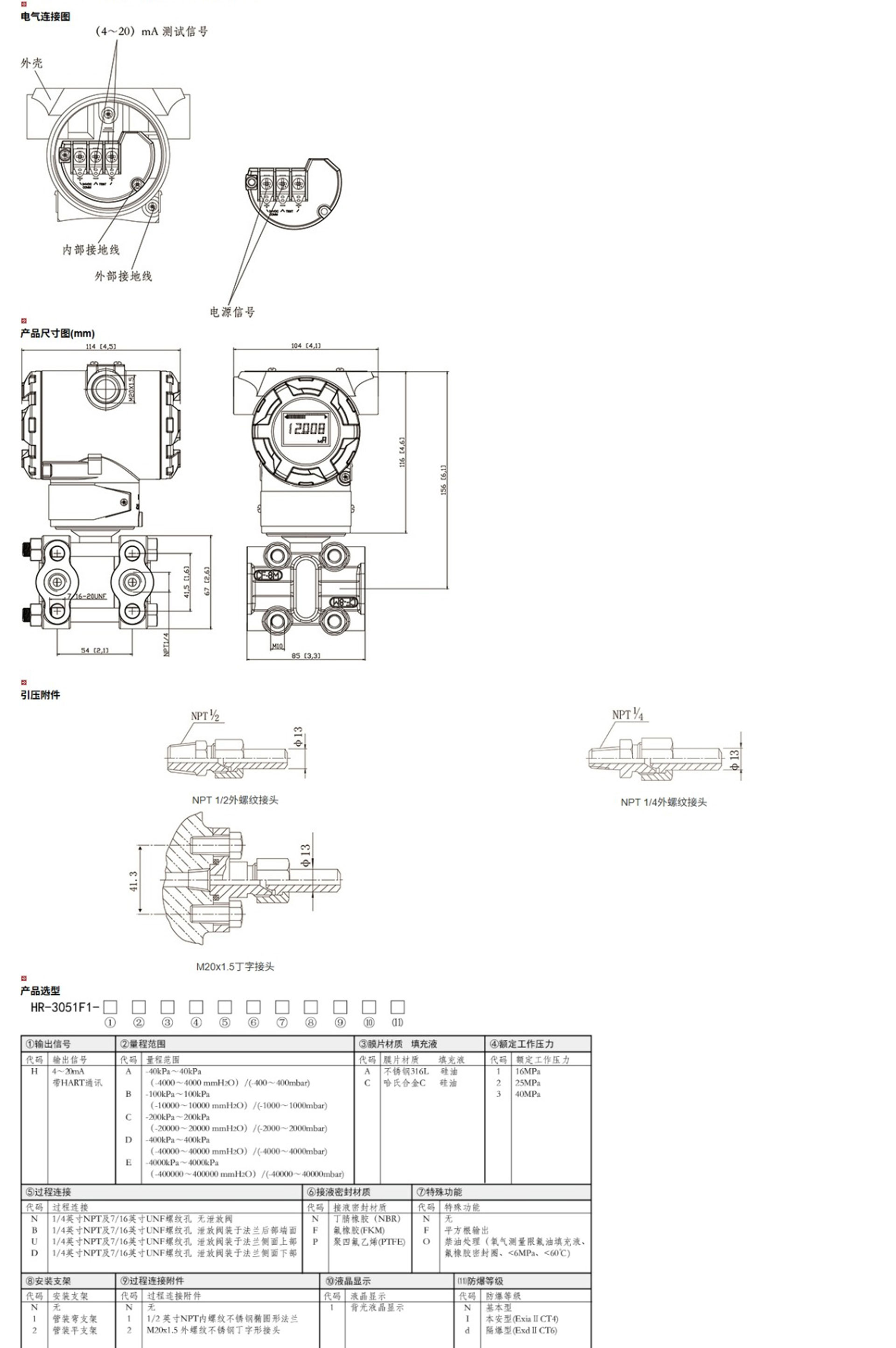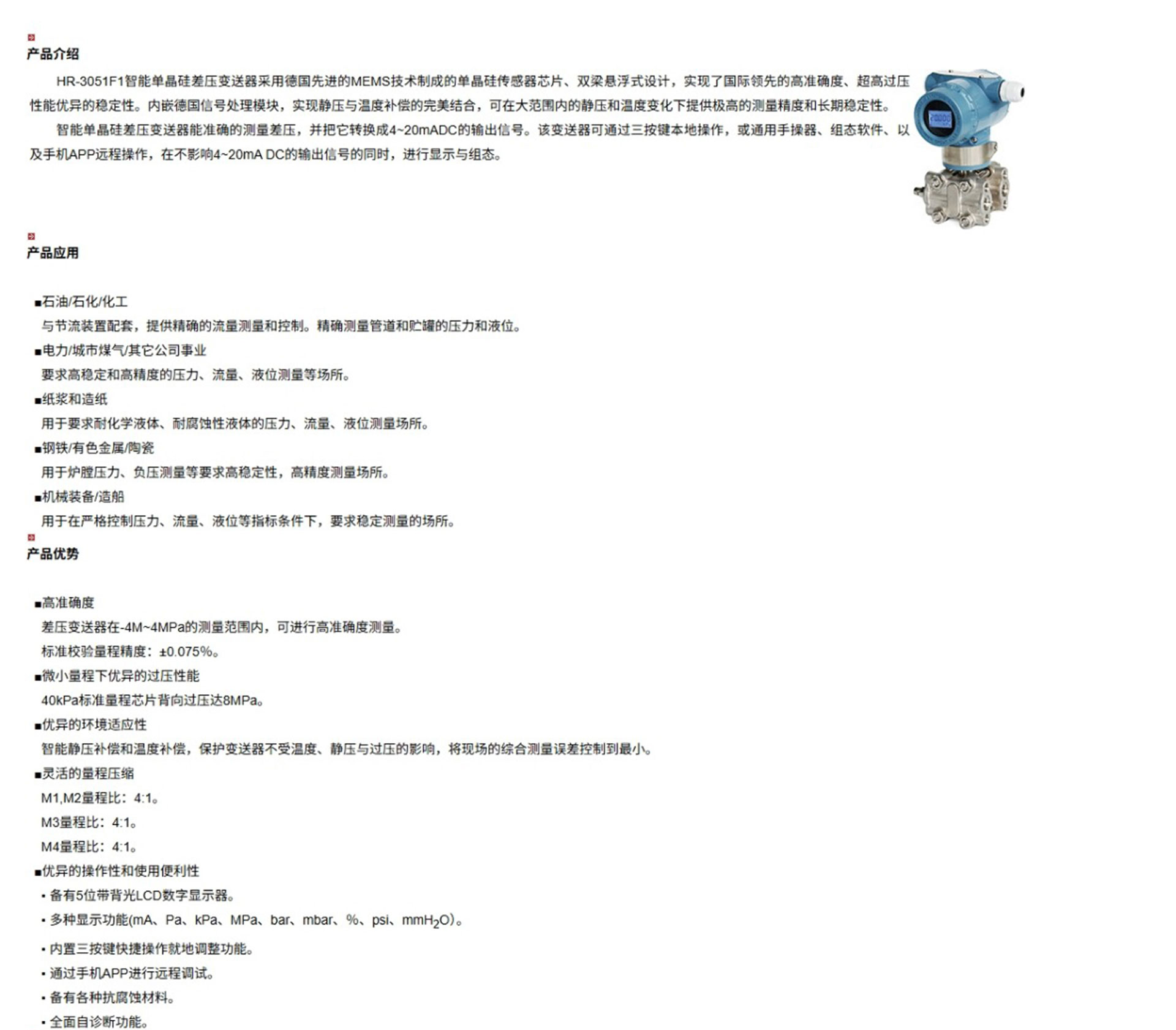 HR-3051F1智能单晶硅差压变送器能准确的测量差压,并把它转换成4~20mADC的输出信号。该变送器可通过三按键本地操作,或通用手操器、组态软件、以及手机APP远程操作,在不影响4~20mA DC的输出信号的同时,进行显示与组态。