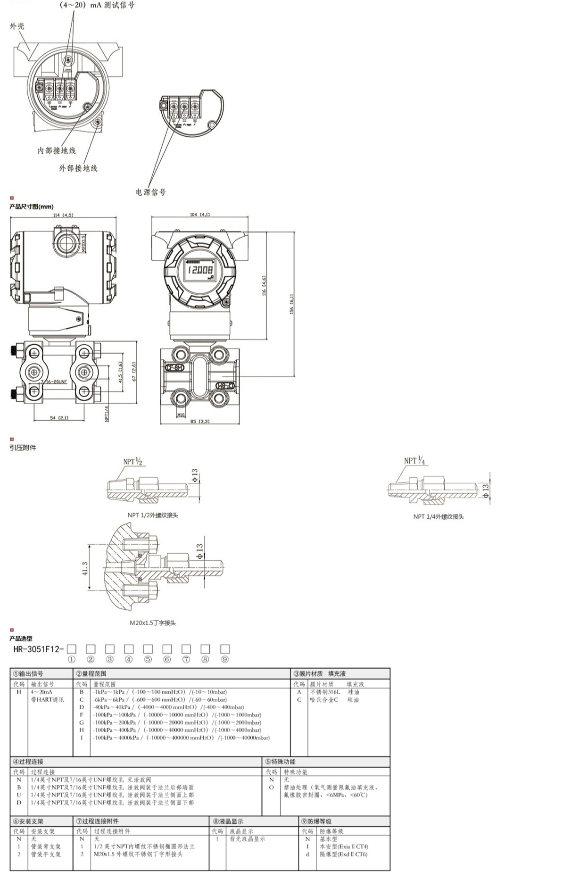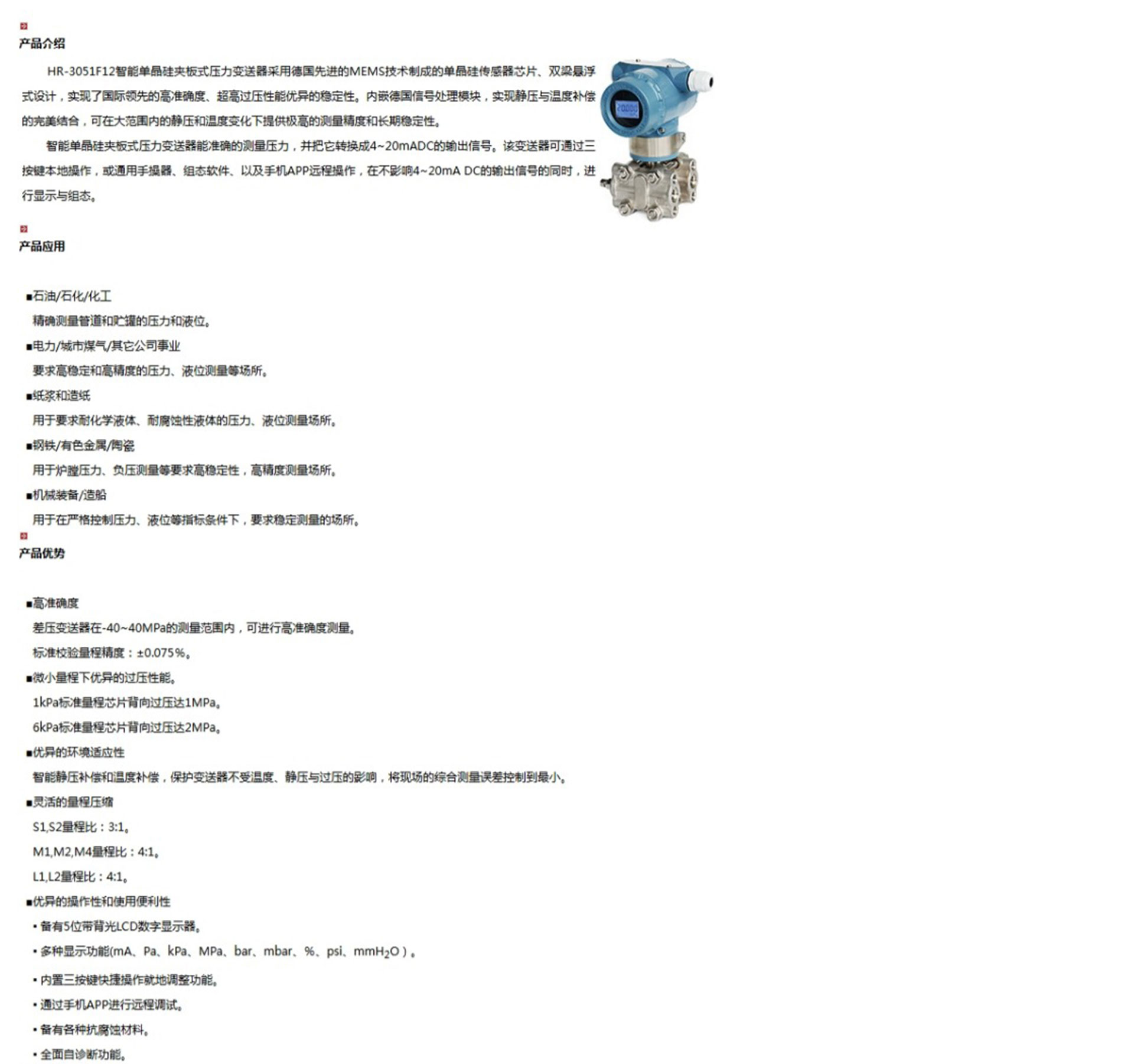 HR-3051F12智能单晶硅夹板式压力变送器能准确的测量压力,并把它转换成4~20mADC的输出信号。该变送器可通过三按键本地操作,或通用手操器、组态软件、以及手机APP远程操作,在不影响4~20mA DC的输出信号的同时,进行显示与组态。