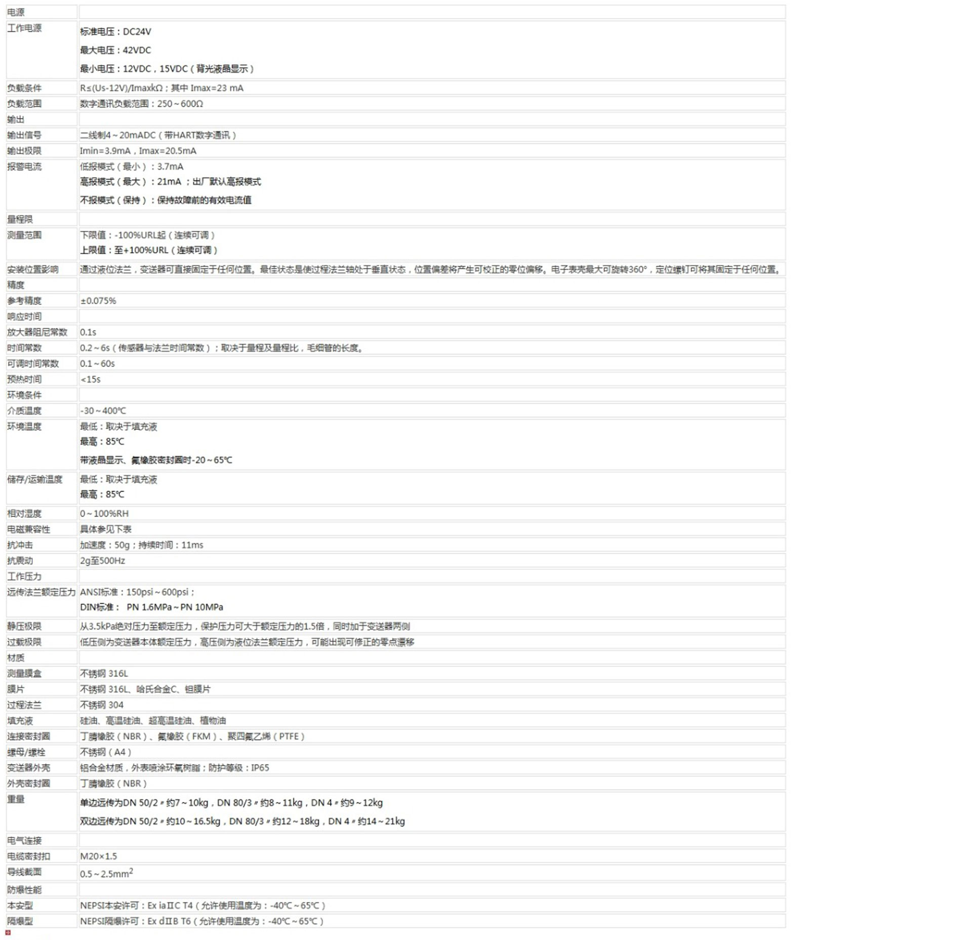 该产品用于测量液体、气体或蒸汽的液位、密度、压力,将其转变成4~20mA (HART)电流输出信号,可通过RST375手持终端对它们进行参数设定、过程监控等。测量范围(未迁移时)为0-1kPa~2MPa,液位法兰的额定压力分别为:1.6/4MPa、6.4MPa、10MPa、150psi、300psi或600psi。