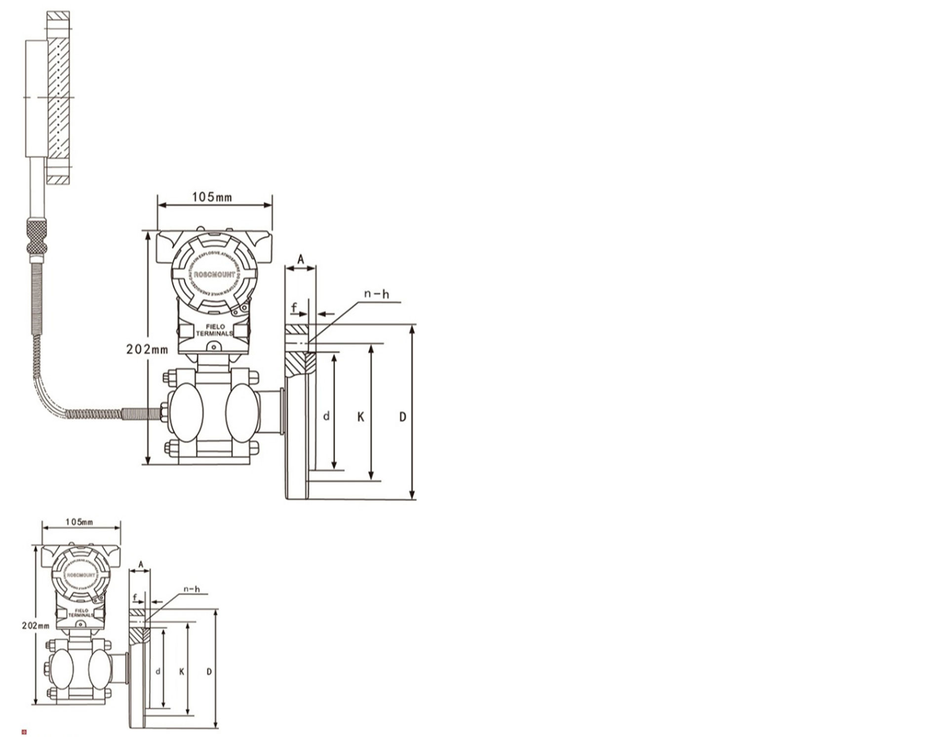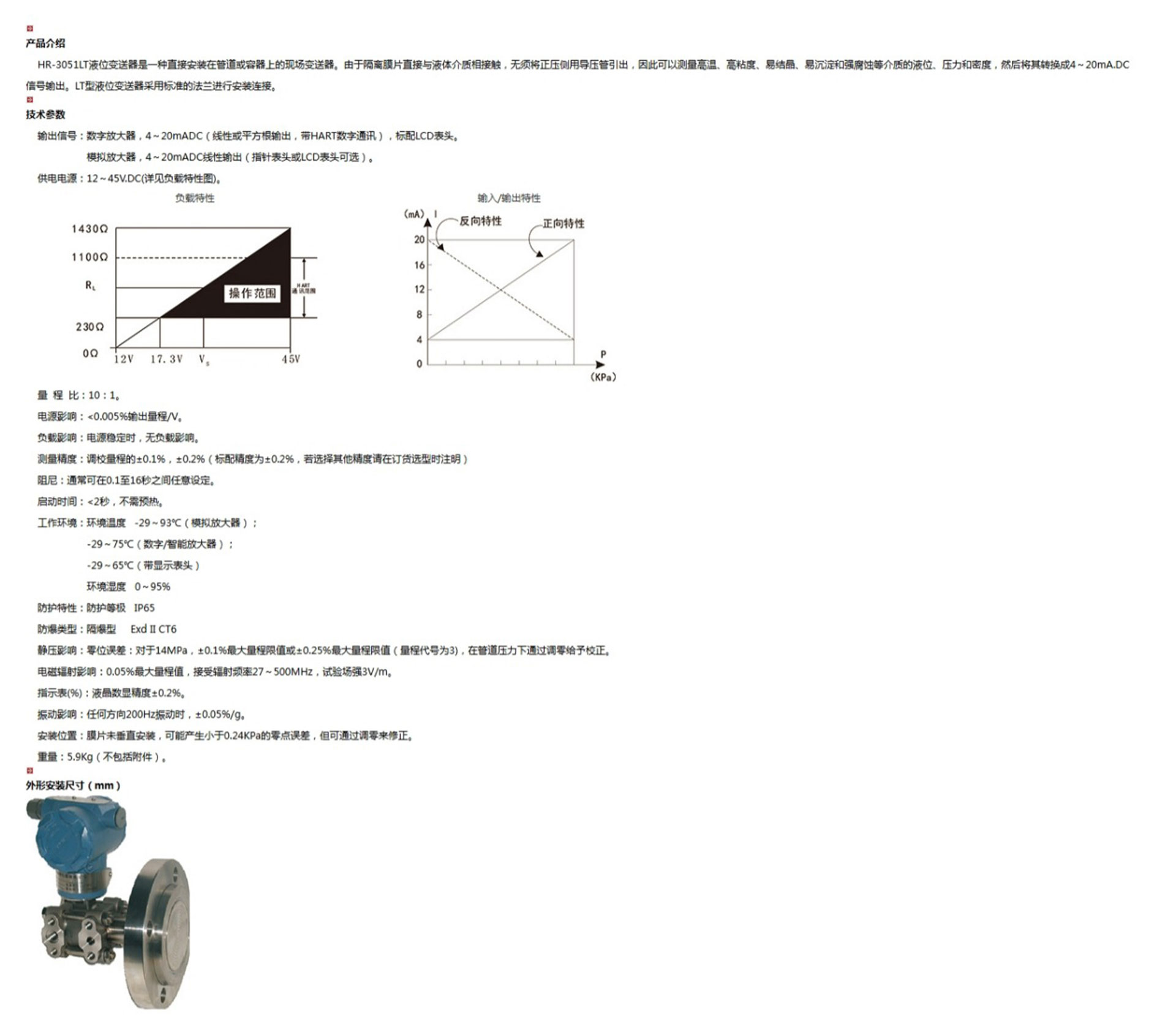 HR-3051LT液位变送器是一种直接安装在管道或容器上的现场变送器。由于隔离膜片直接与液体介质相接触,无须将正压侧用导压管引出,因此可以测量高温、高粘度、易结晶、易沉淀和强腐蚀等介质的液位、压力和密度,然后将其转换成4~20mA.DC信号输出。