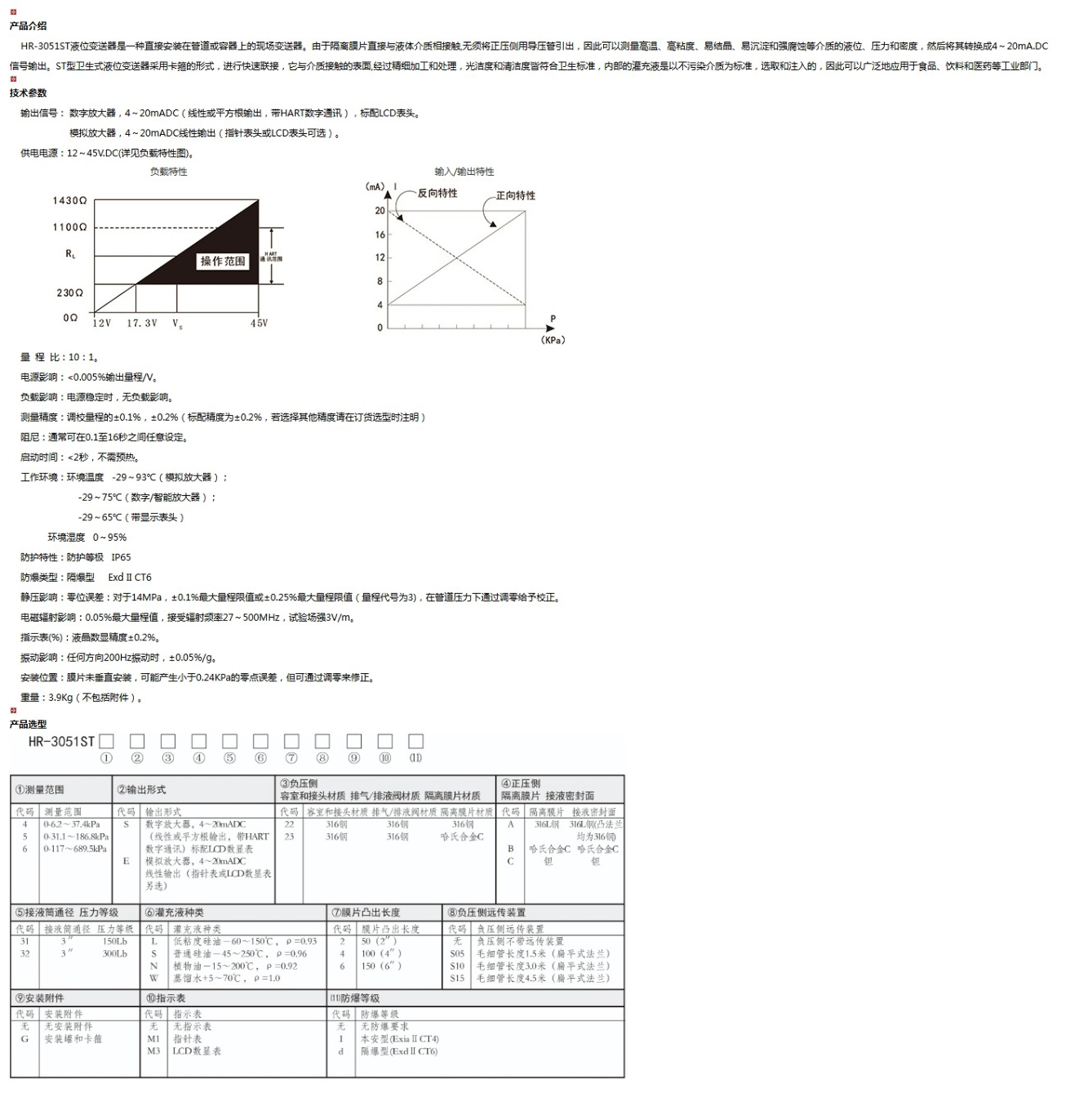 HR-3051ST液位变送器是一种直接安装在管道或容器上的现场变送器。由于隔离膜片直接与液体介质相接触,无须将正压侧用导压管引出,因此可以测量高温、高粘度、易结晶、易沉淀和强腐蚀等介质的液位、压力和密度,然后将其转换成4~20mA.DC信号输出。