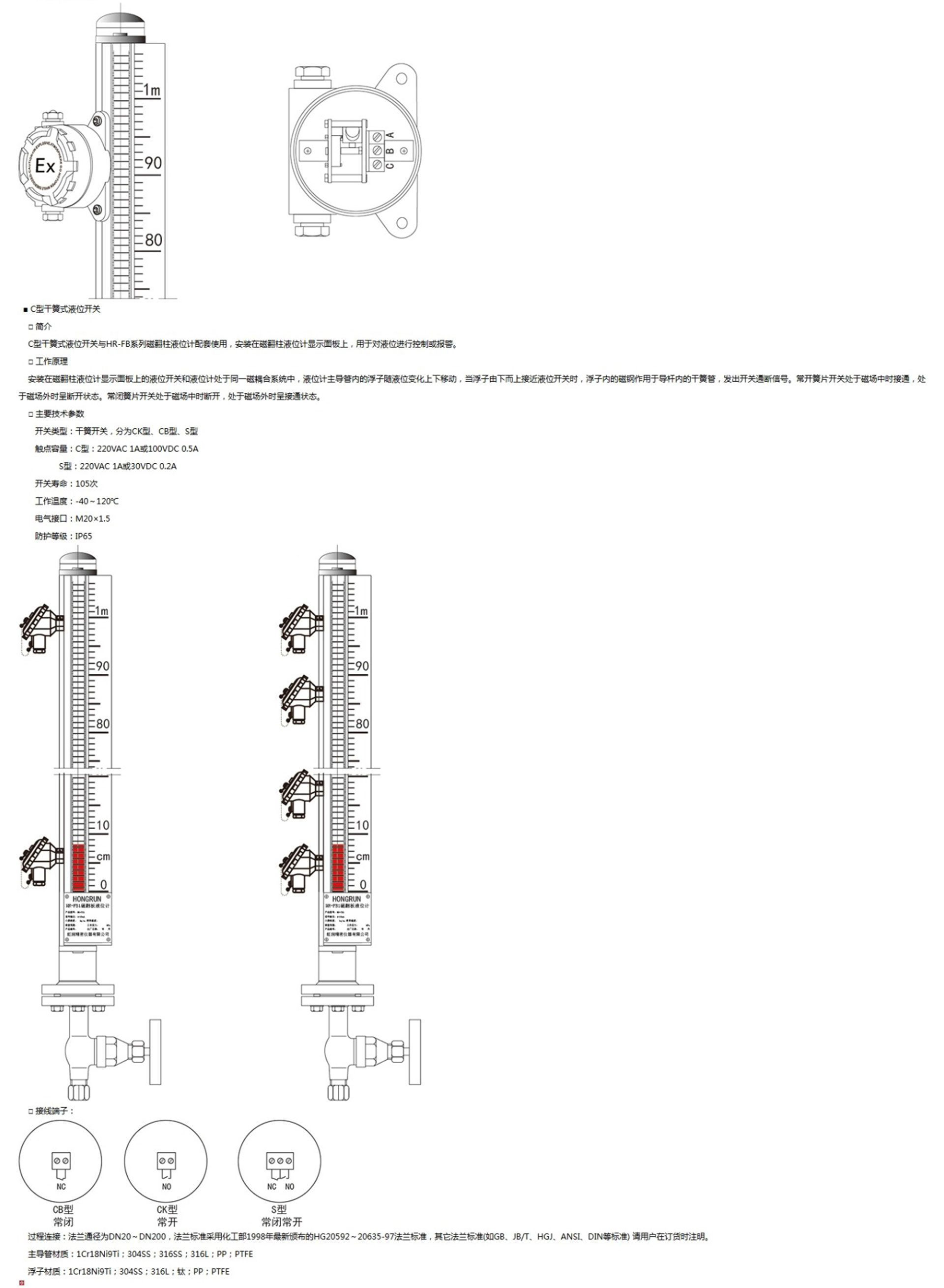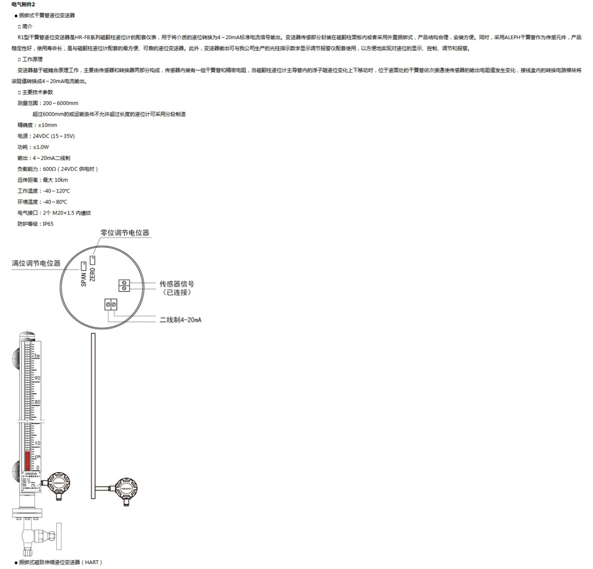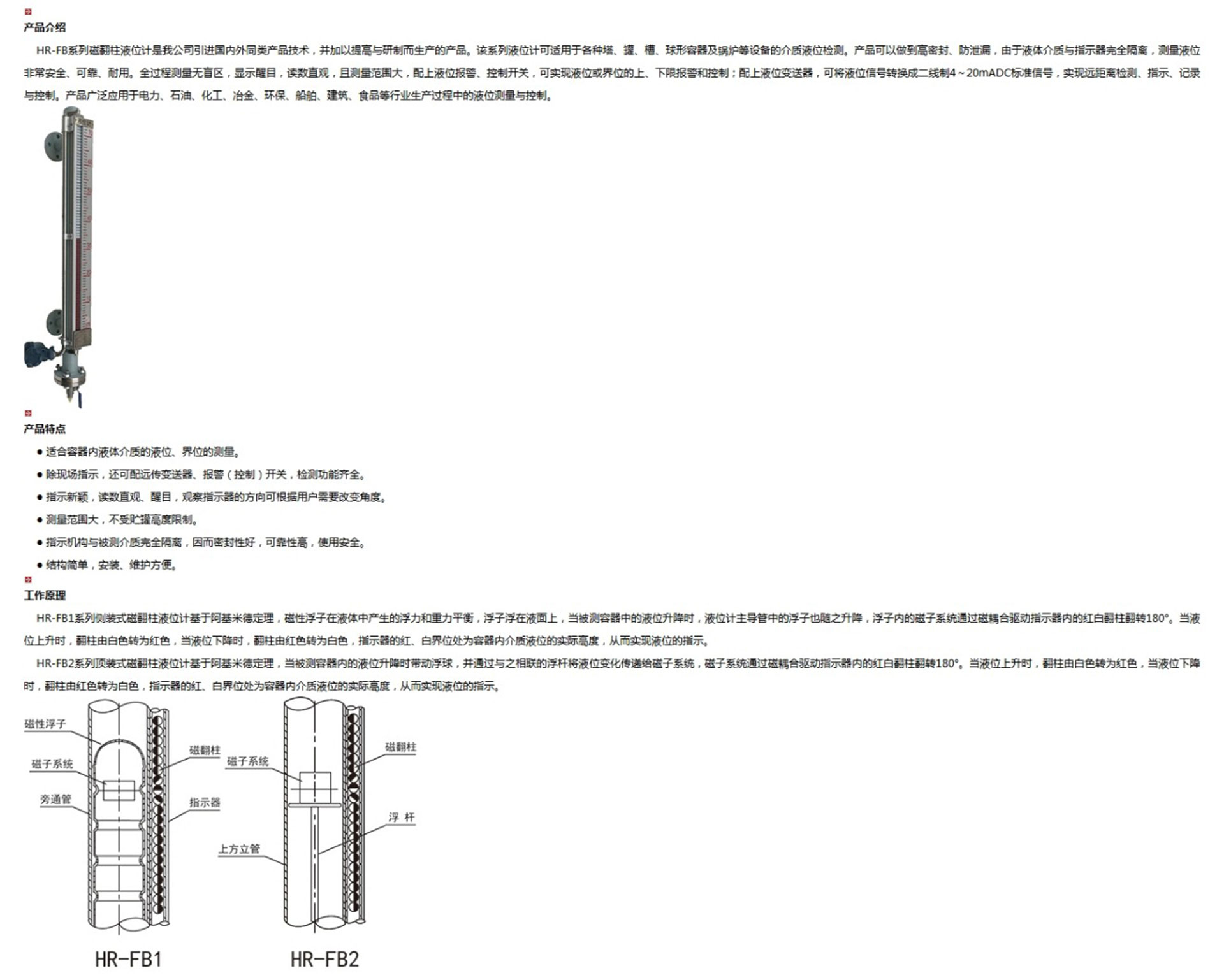 HR-FB系列磁翻柱液位计是我公司引进国内外同类产品技术,并加以提高与研制而生产的产品。该系列液位计可适用于各种塔、罐、槽、球形容器及锅炉等设备的介质液位检测。产品可以做到高密封、防泄漏,由于液体介质与指示器完全隔离,测量液位非常安全、可靠、耐用。
