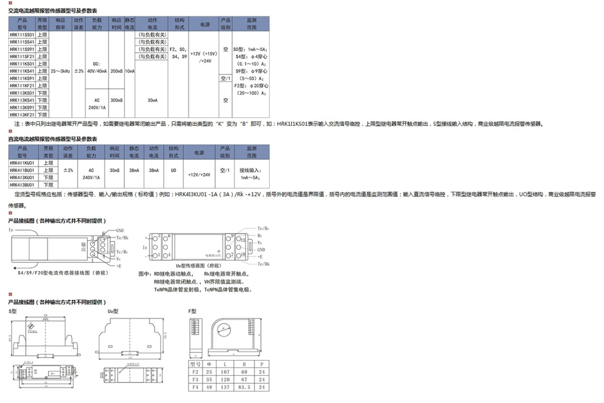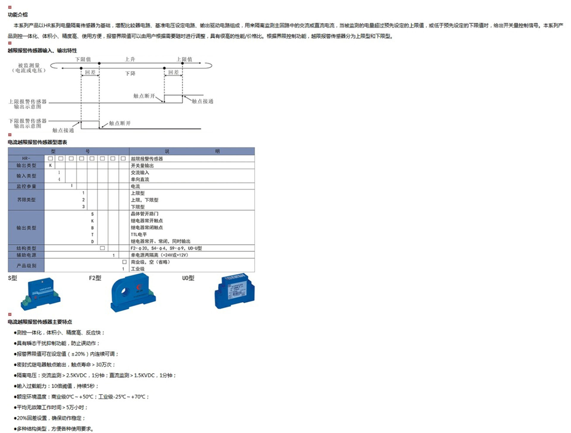 电流越限报警传感器以HR系列电量隔离传感器为基础,增配比较器电路、基准电压设定电路、输出驱动电路组成,用来隔离监测主回路中的交流或直流电流,当被监测的电量超过预先设定的上限值,或低于预先设定的下限值时,给出开关量控制信号。