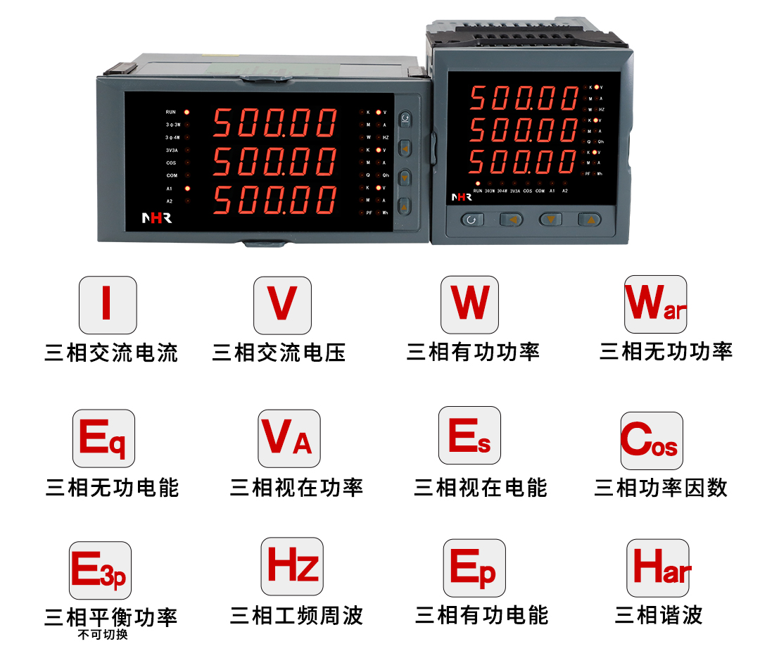 NHR-3300系列三相综合电量表采用大规模集成电路和高亮度长寿命的LED显示器,应用数字采样技术,对三相电气线路中的相电压、线电压、相电流、线电流、有功功率、无功功率、视在功率、频率、功率因数、等进行实时测量显示与控制。