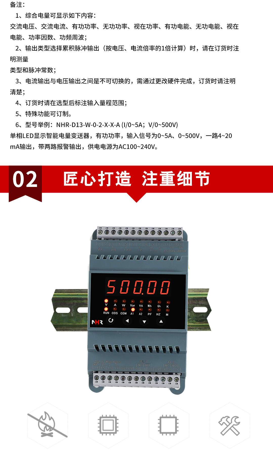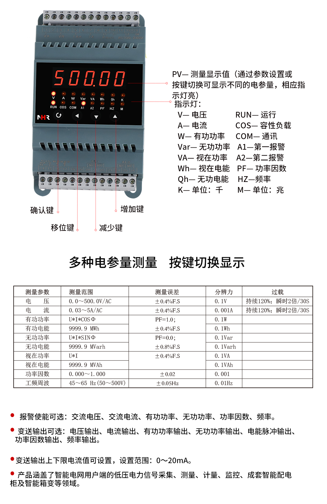 NHR-D13系列单相LED显示智能电量变送器是一款高性价比的智能电参数变送器,采用大规模集成电路,以低功耗的微处理器为核心,带五位LED数码显示及报警指示灯指示,配备按键操作更加方便。